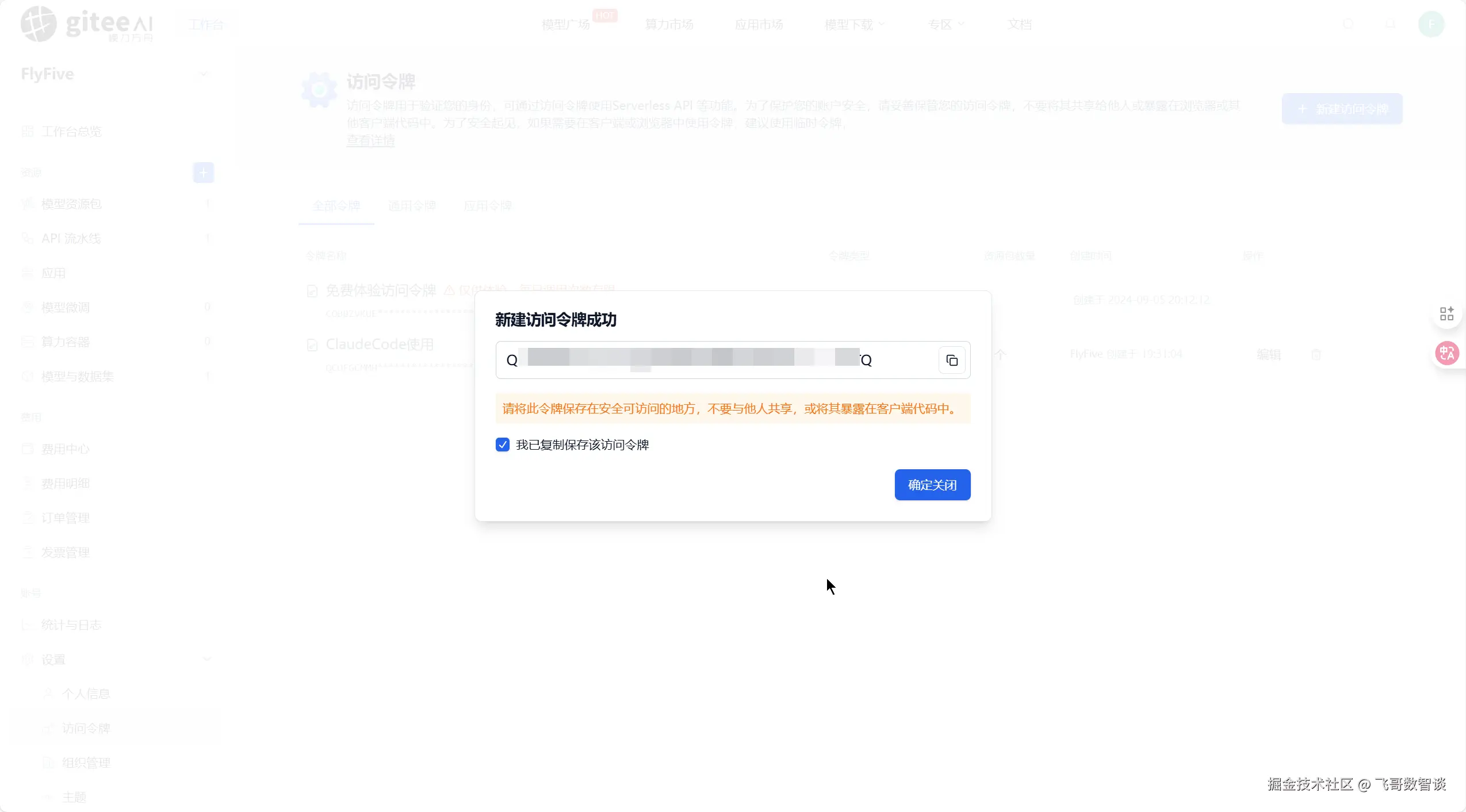 复制创建成功后的令牌并保存好,后续要用。