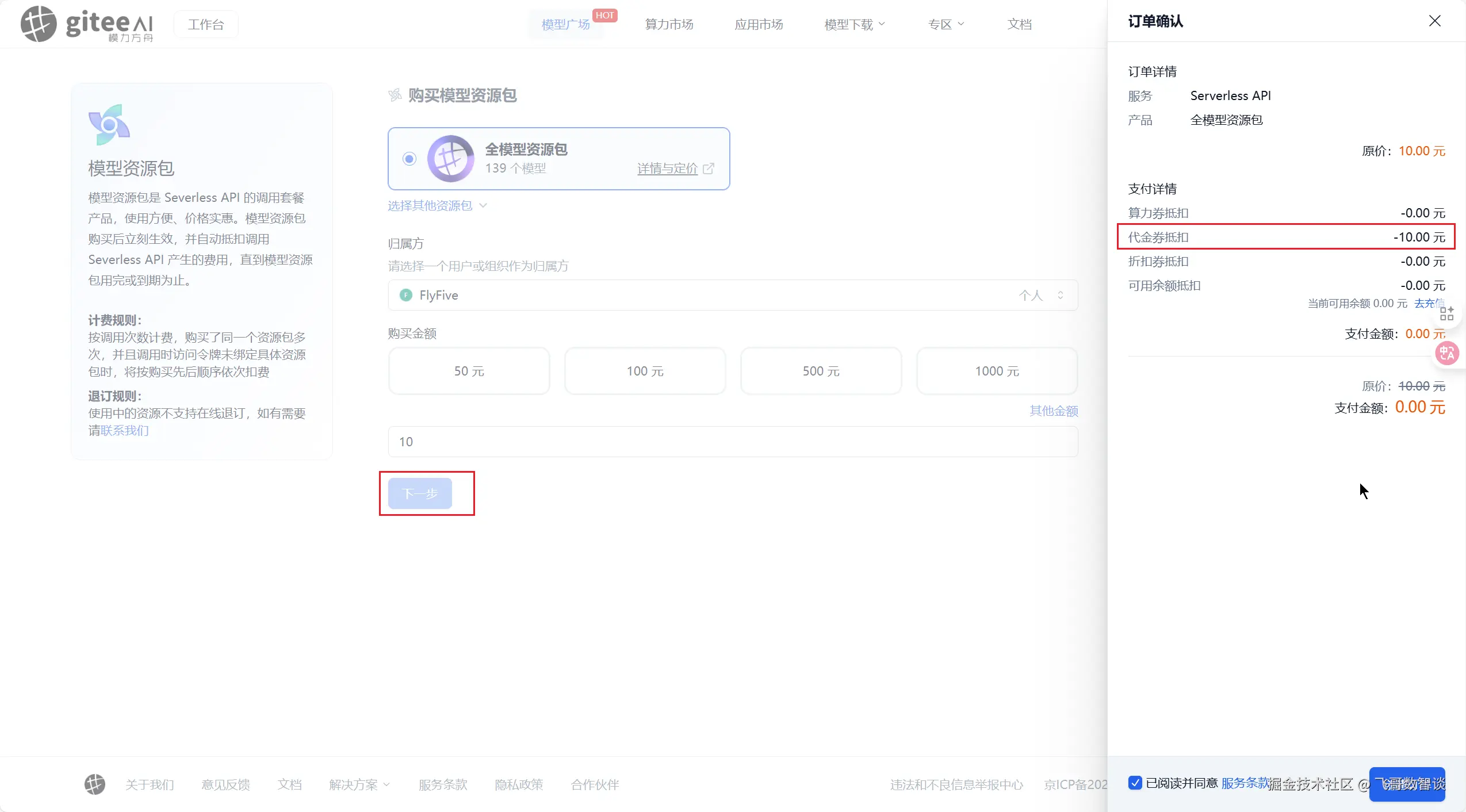 - 资源授权:需要选择一个资源包,这里我们直接使用代金券购买一个新的模型资源包,我先买了 10 元的。