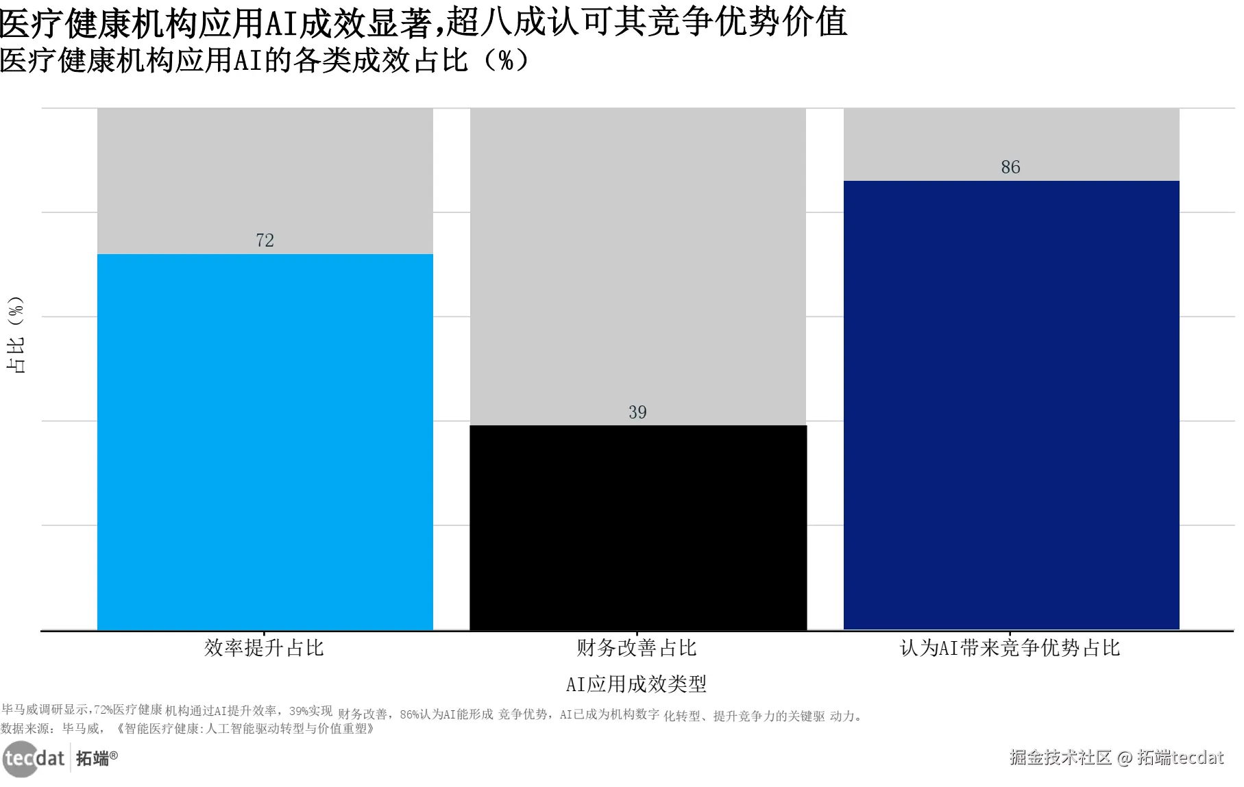 医疗健康机构应用AI成效(含完整标题注释)灰底比例条形图图表数据及PDF模板已分享到会员群