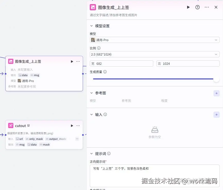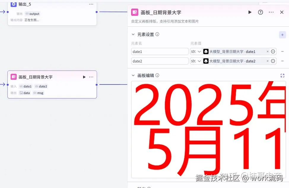 接下来用画板节点完成大字素材的生成,元素直接链接为大模型处理的输出即可,非常方便