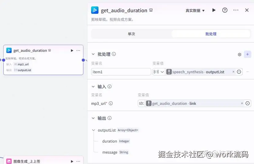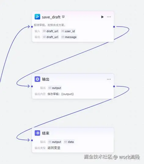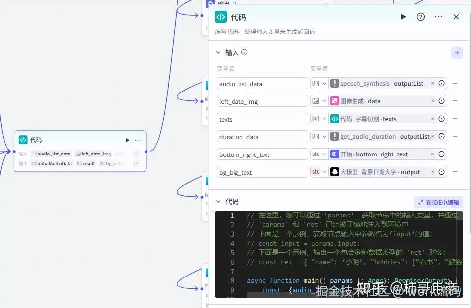 首先是一个代码节点,相当于把前面生成的所有素材(音频、图片、字幕、特效)参数 “打包整理”,再传给剪映节点,是 素材→剪映”的重要步骤