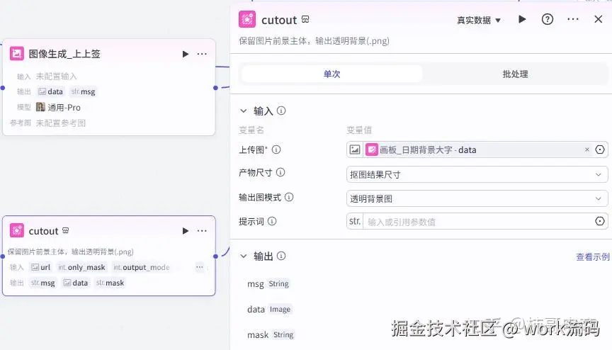 所以这一步还需要添加一个抠图节点,将上一个画板节点的大字抠成透明底,这样大字部分就完成了