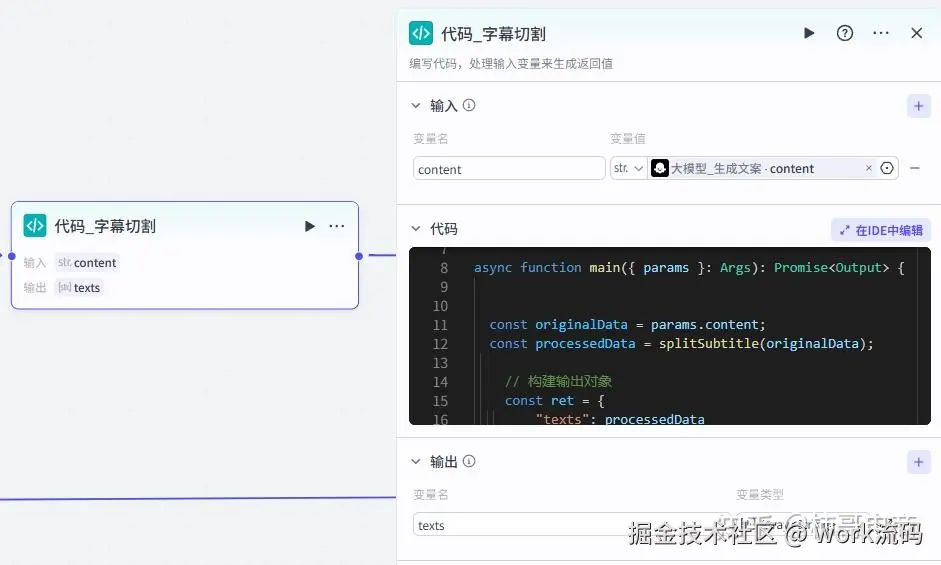 生成的文案比较长,需要分镜展示 这里用代码节点写了一个 splitSubtitle 方法,根据标点符号把文案切成若干小段,方便后续做字幕和镜头循环