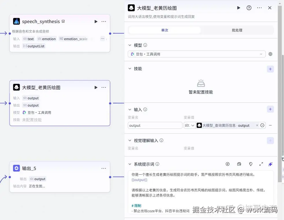 这个大模型节点会把黄历信息进一步包装成 趣味文案,输出类似公众号黄历风格的文本 比如提醒属牛要谨慎社交,属兔适合创作,最后再加一句互动引导