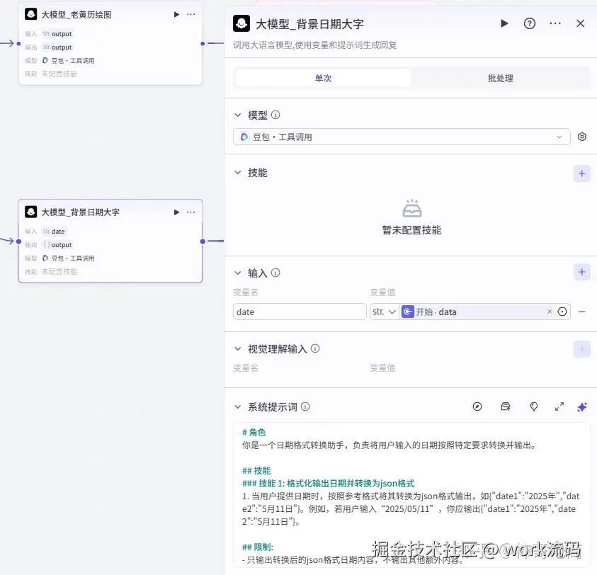 在这里,大模型会将我们在开始节点输入的日期转换成指定的格式,方便后续生成大字素材