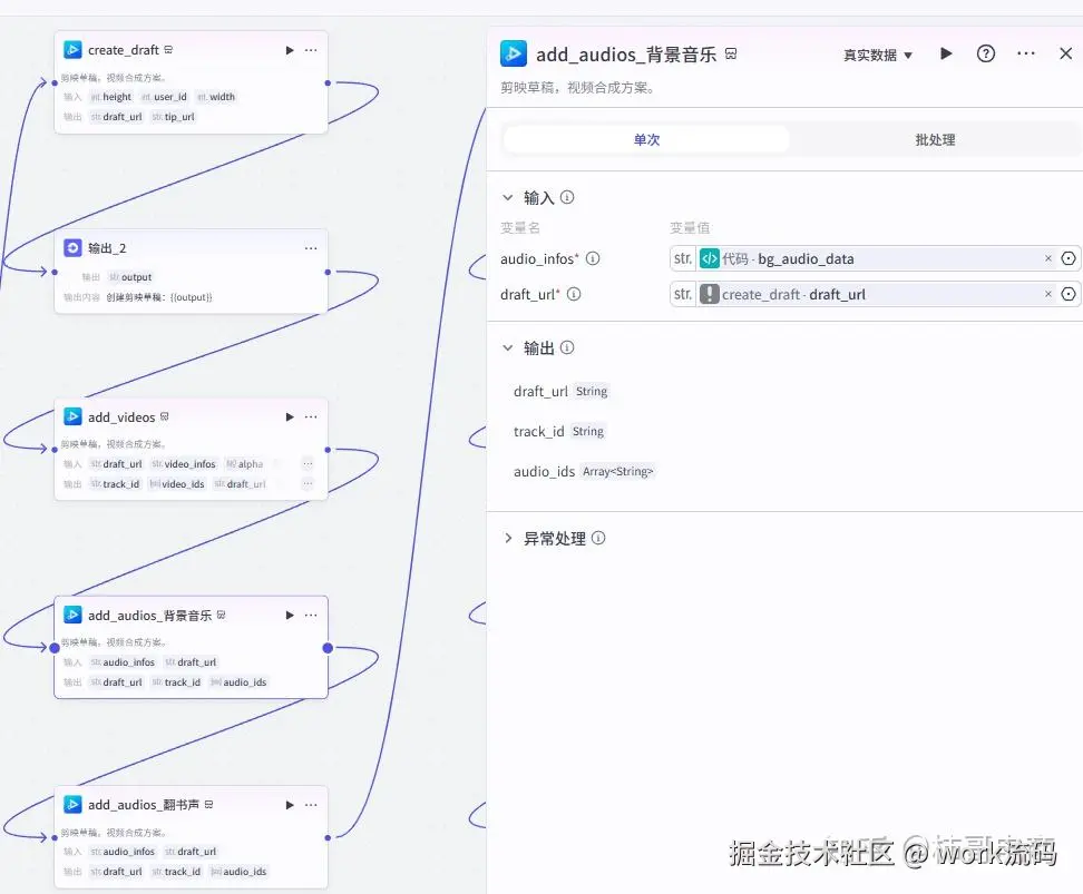 这部分是 “核心组装环节”,用 10 + 剪映节点把所有素材(视频背景、音频、图片、特效)整合,最后出可直接用的剪映草稿