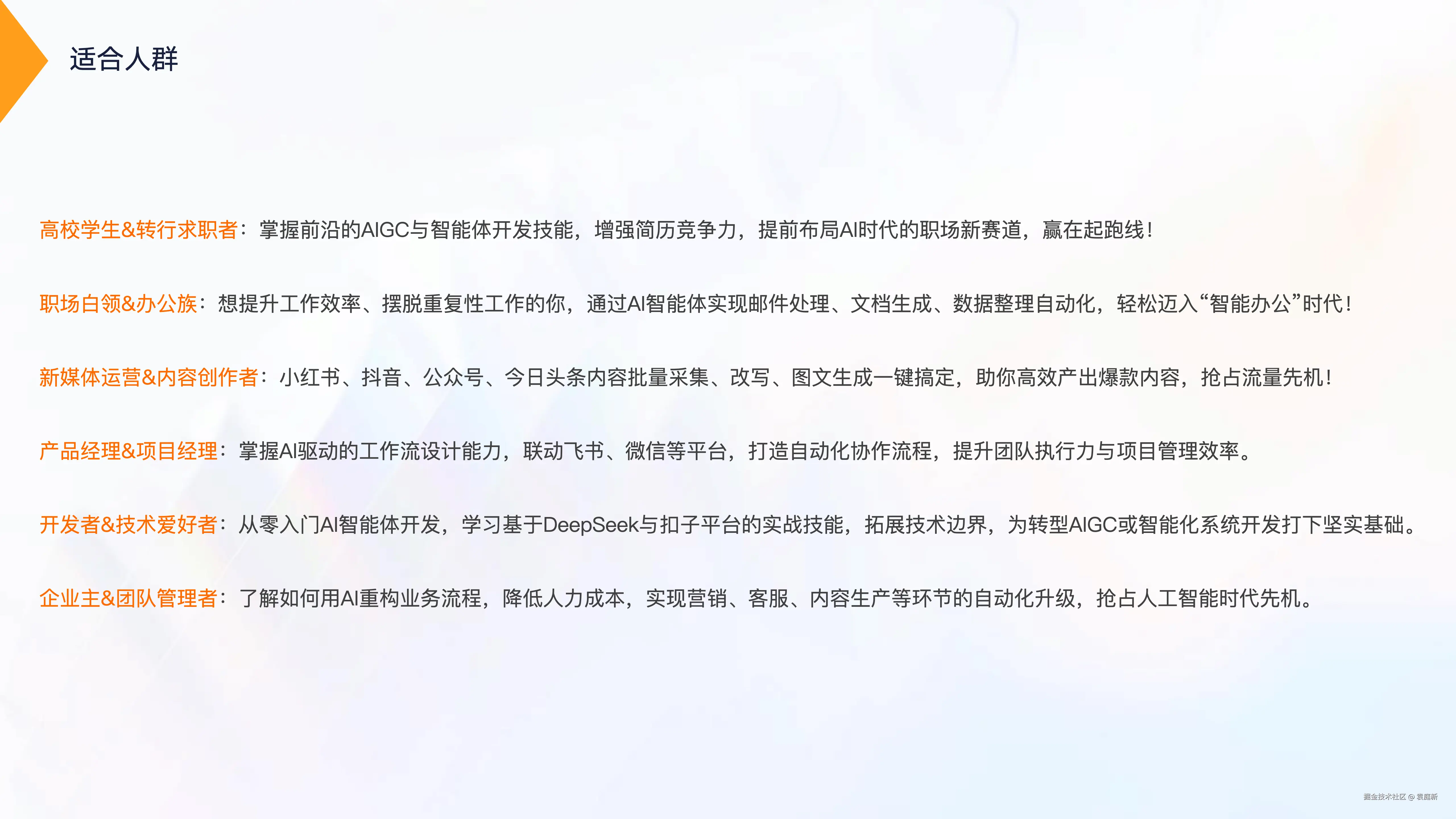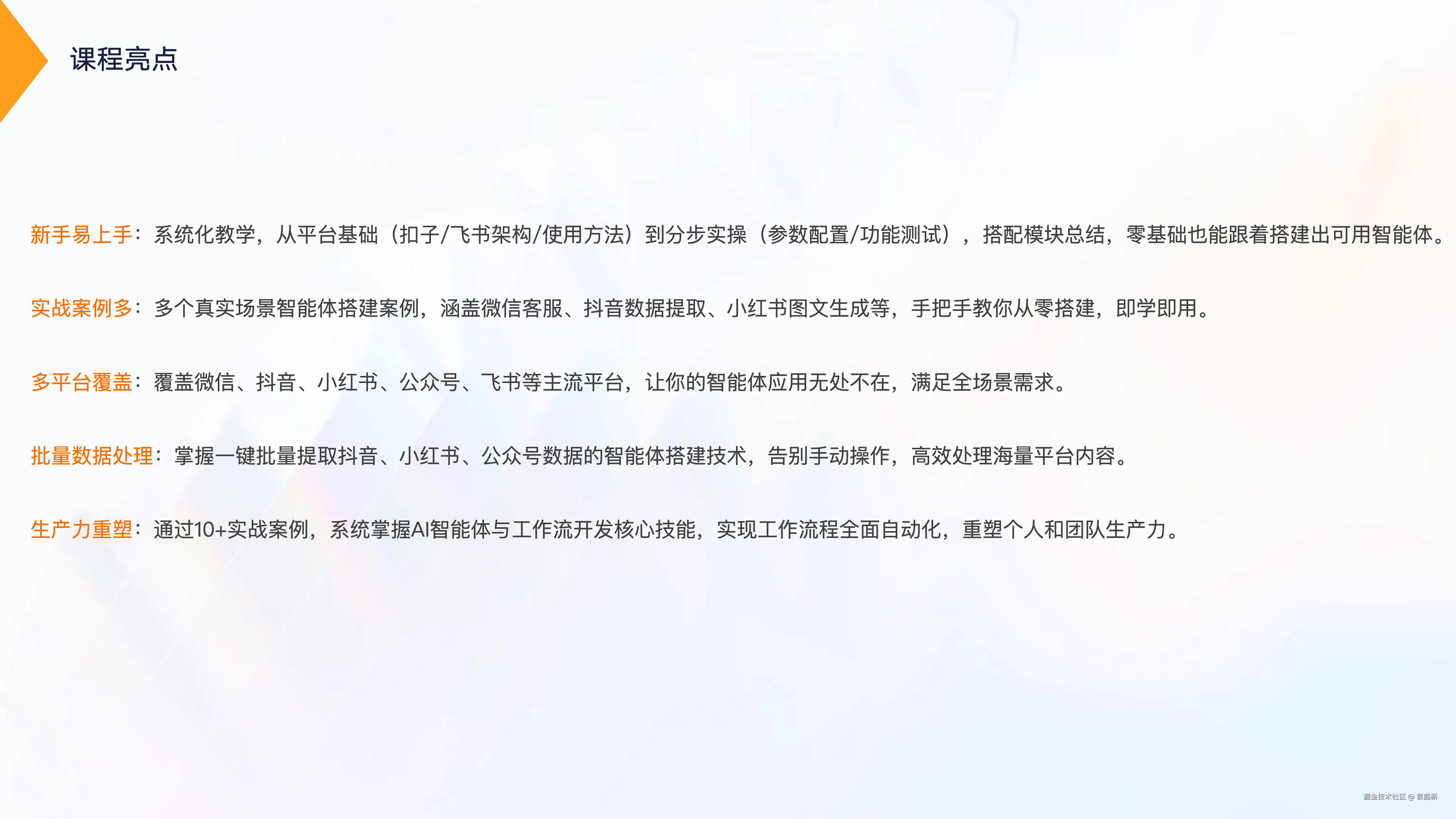 课程亮点有哪些呢?总结了5条。新手易上手,有着系统话教学,零基础也能跟着搭建出可用智能体。实战案例多,多个真实场景智能体搭建案例。多平台覆盖,覆盖微信、抖音、小红书、公众号、飞书等主流平台。批量数据处理,告别手动操作,高效处理海量平台内容。生产力重塑,实现工作流程全面自动化,重塑个人和团队生产力。