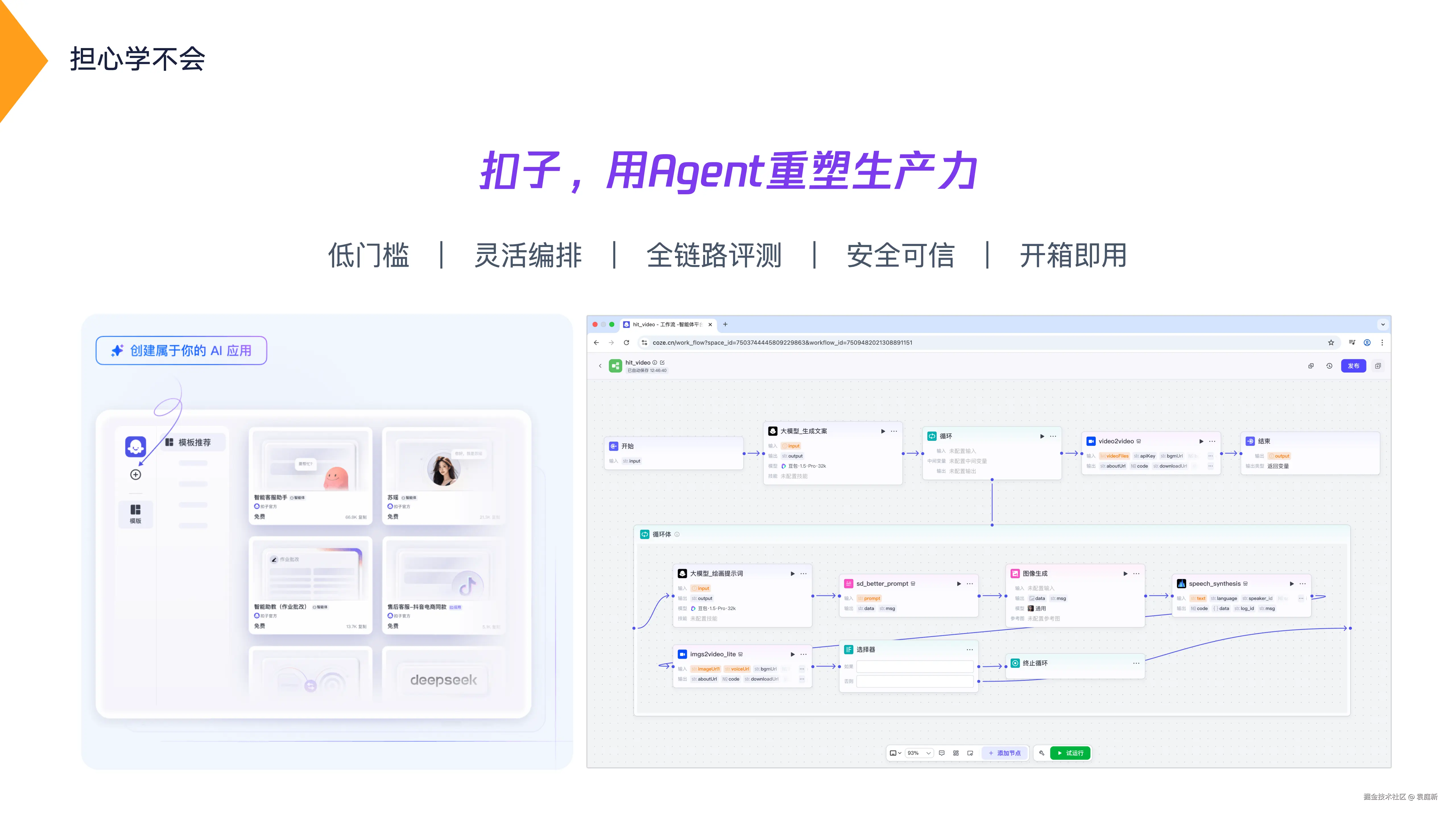 有同学会担心,我不是学计算机的,也不懂编程,能学的会吗?完全不用怕!扣子(Coze)的设计本身就特别照顾非计算机、非编程背景的人,它把复杂的技术逻辑都做了简化,不用写代码,跟着步骤搭流程、选工具就能上手。不管你之前是学文科、理科,还是没接触过任何技术,只要愿意跟着学,从简单的小项目练起,很快就能掌握,人人都能学会用它做出自己想要的应用~