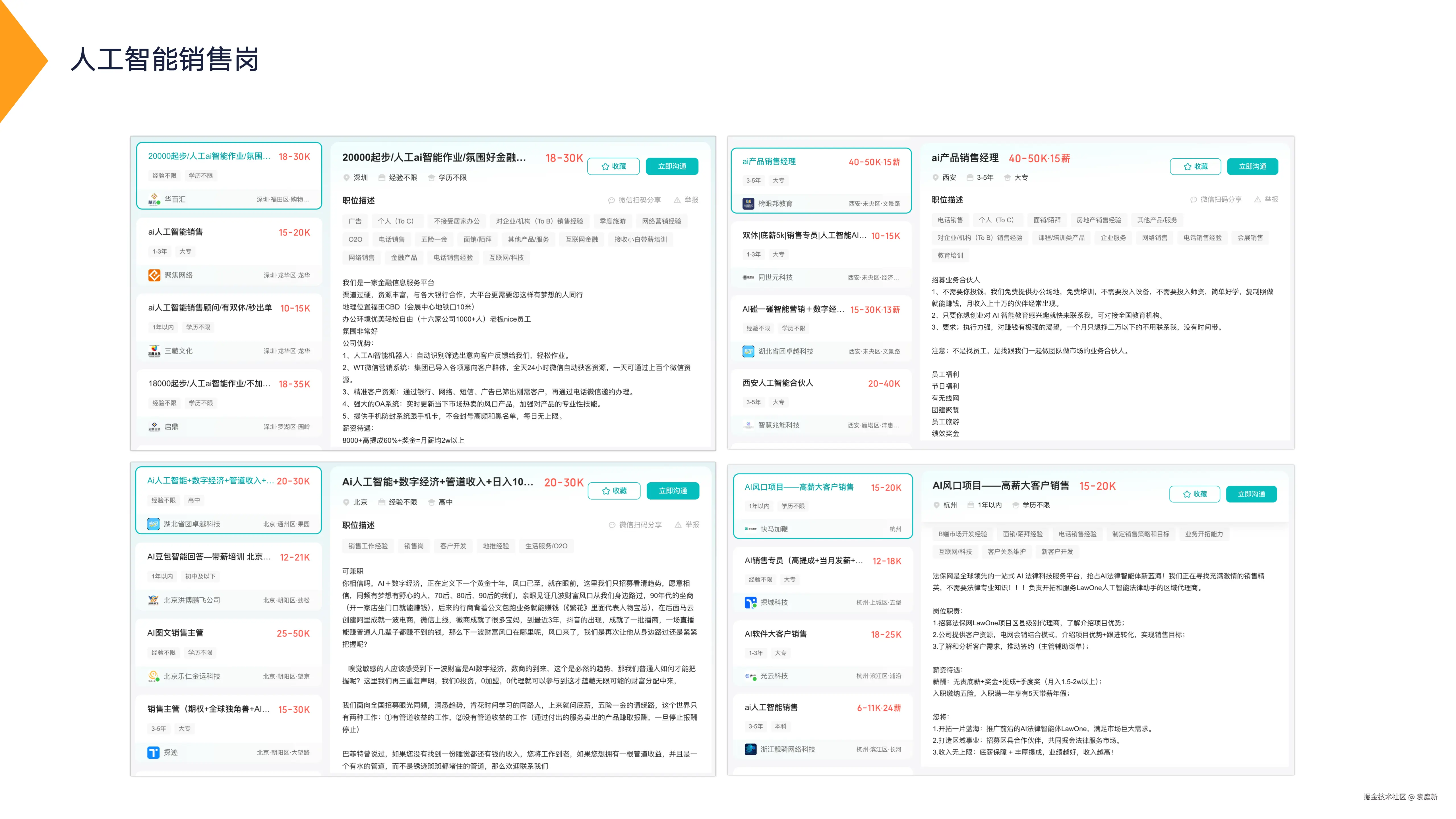 接下来我带领同学们来看下市场对人才的要求,即使是一些基础岗位,如销售岗,也开始要求应聘者具备一定的AI能力。过去行政岗是一个再传统不过的岗位,企业在进行人才筛选时,现在也把AI能力作为隐形标准了。再来看看运营岗,有AI运营助理、AI线上运营、AI内容运营、AI运营项目经理等等,都与AI相关了。同时随着人工智能技术的发展,还诞生了很多新职业新工种,如生成式人工智能系统应用员、生成式人工智能动画制作员、人工智能训练师、人工智能数字人训练师、数据标注师等。预计未来几年,这些新兴岗位数量将以每年20%的速度增长。