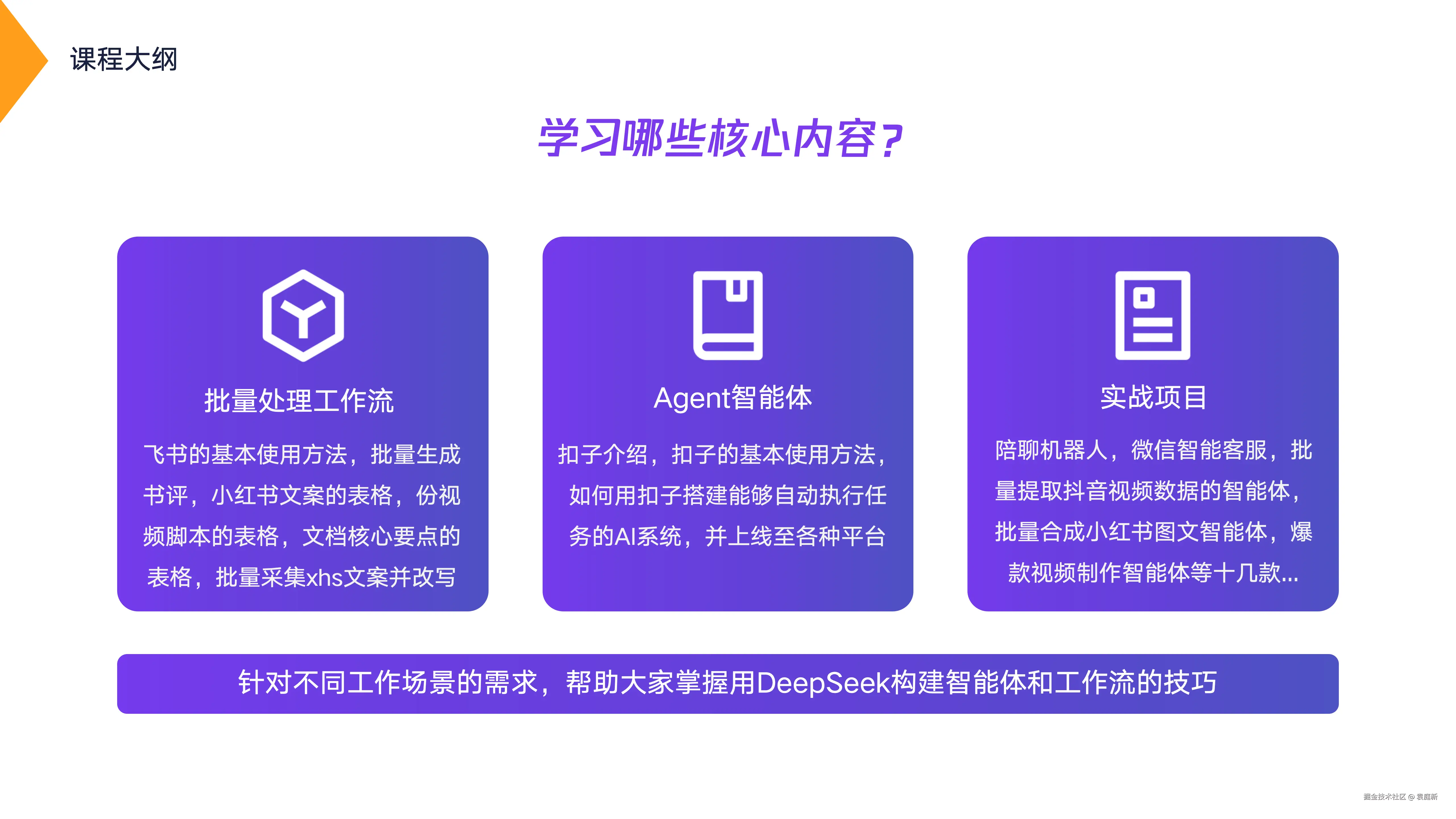 这套课程分为三个板块的内容:批量处理工作流、Agent智能体和实战项目。针对不同工作场景的需求,帮助大家掌握用DeepSeek构建智能体和工作流的技巧。