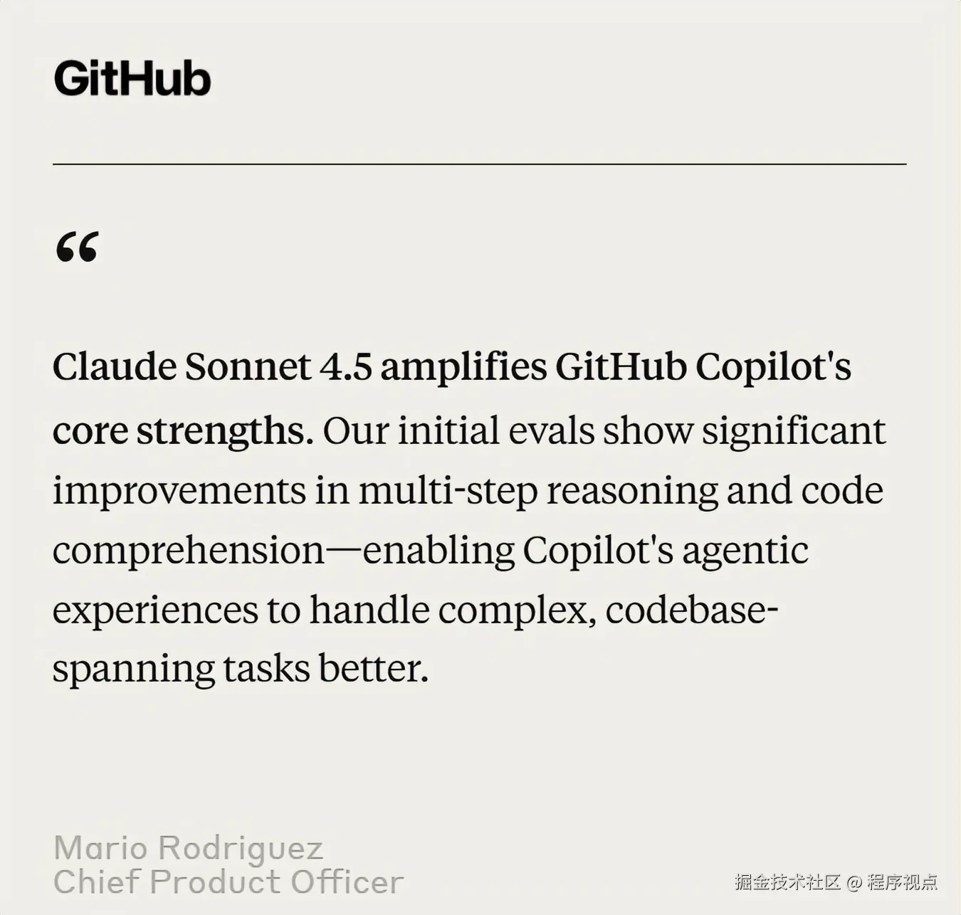 GitHub CPO说:"Claude Sonnet 4.5 增强了 GitHub Copilot 的核心优势 。"