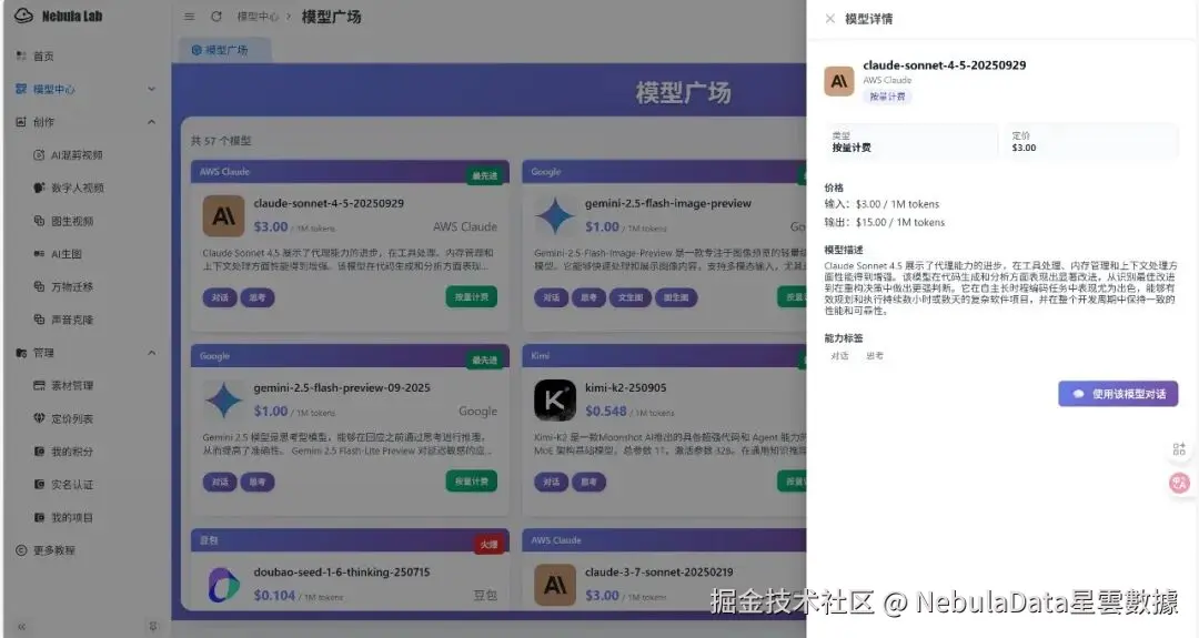 Nebula API本身带有“新加坡血统”,不仅母公司星雲數據总部位于新加坡,而且是联合新加坡南洋理工大学研发的大模型集成平台,即可合规调用 Claude 4.5 的全部能力。