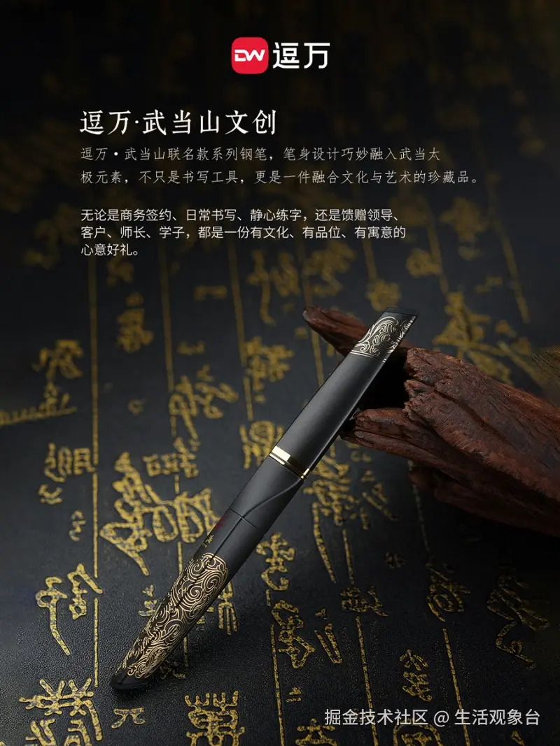 时值国庆、中秋双节将至,兼具传统文化底蕴与创新设计精神的文创品牌逗万Dareworks,正式推出逗万太一钢笔武当联名款。这款融合武当文化精髓与现代制笔工艺的新品,既是对中华优秀传统文化的致敬,也是逗万Dareworks为国庆中秋双节献上的文化厚礼。