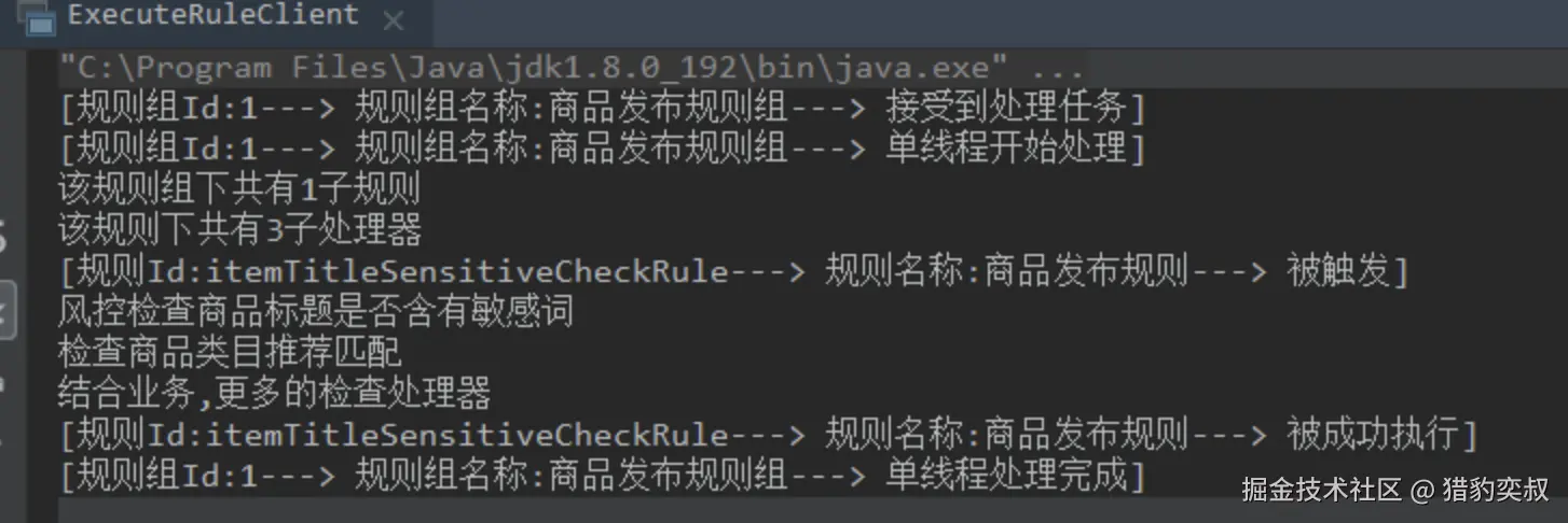 System.out.println("[规则Id:" + rule.getId() + "---> 规则名称:" + rule.getName() + "---> 被成功执行]");