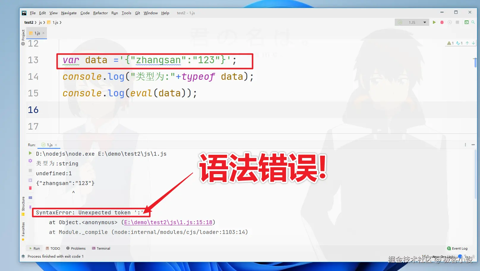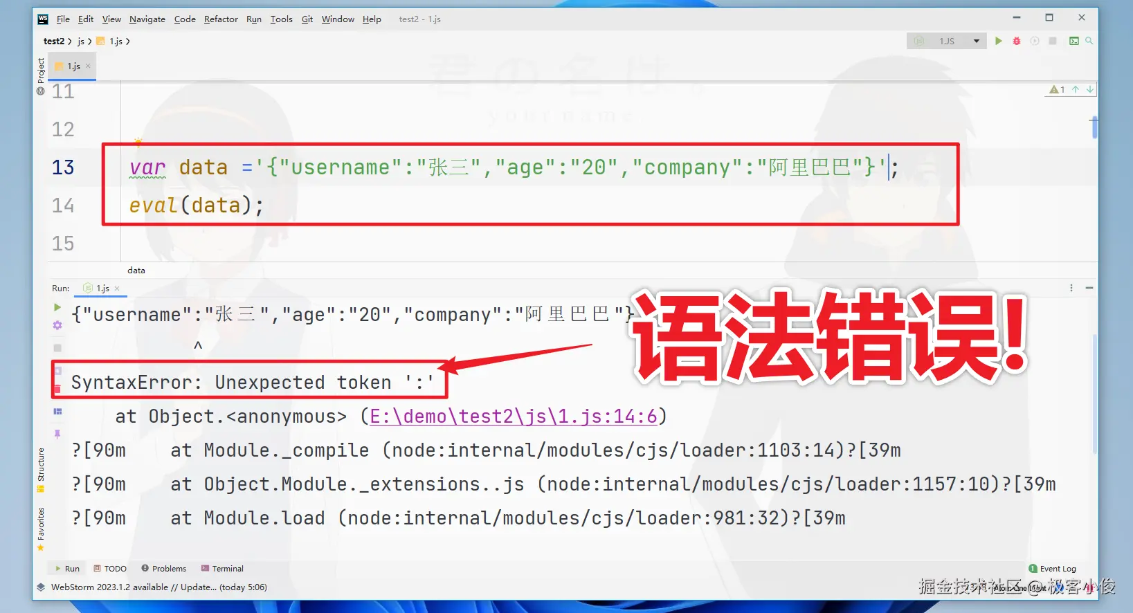 可是你可能会想,这不就是我们常见的JSON数据吗,虽然是字符串, 不能直接使用,但是使用eval()函数处理以下应该可以直接调用了呀,可为什么会报错呢?