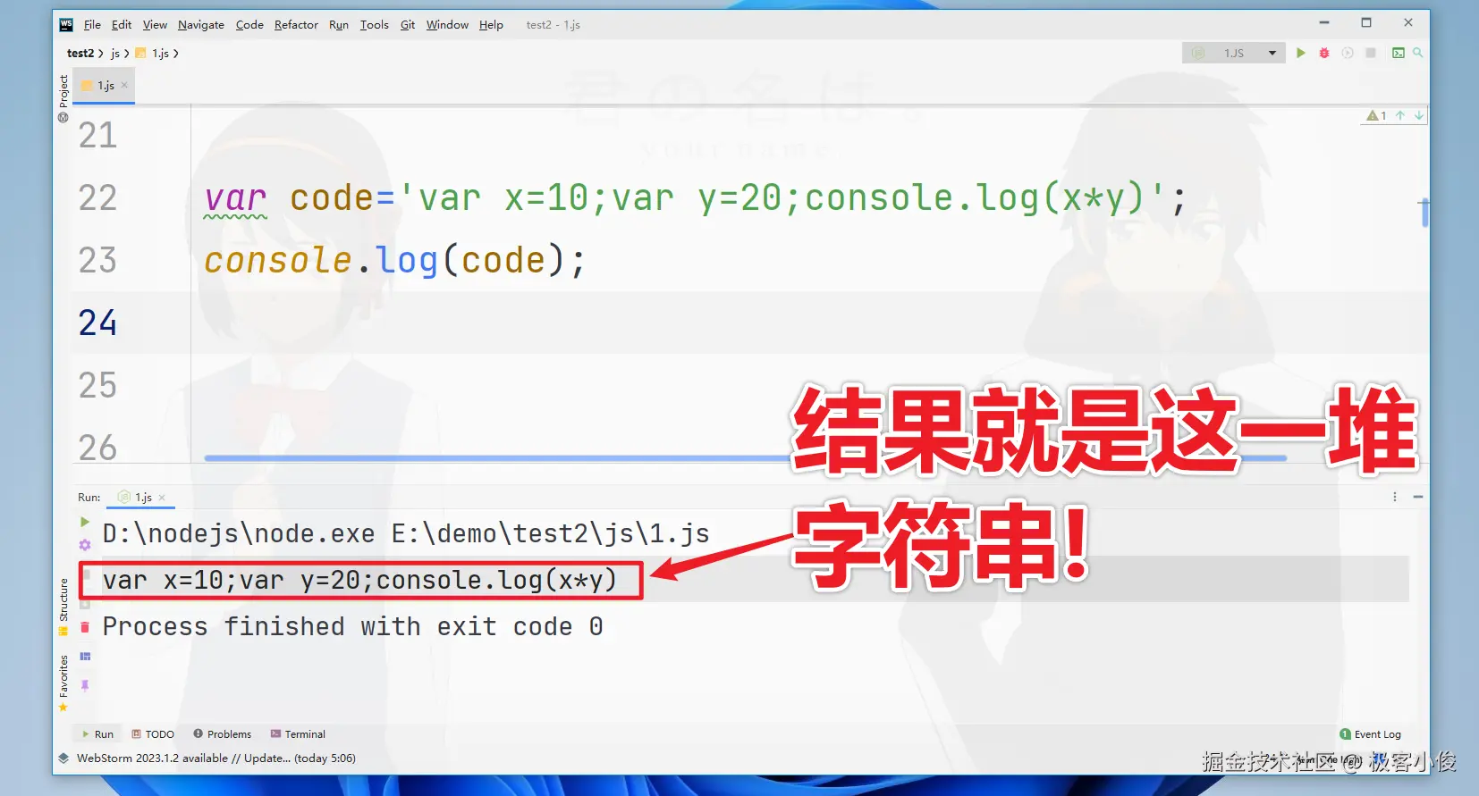 var code='var x=10;var y=20;console.log(x*y)';