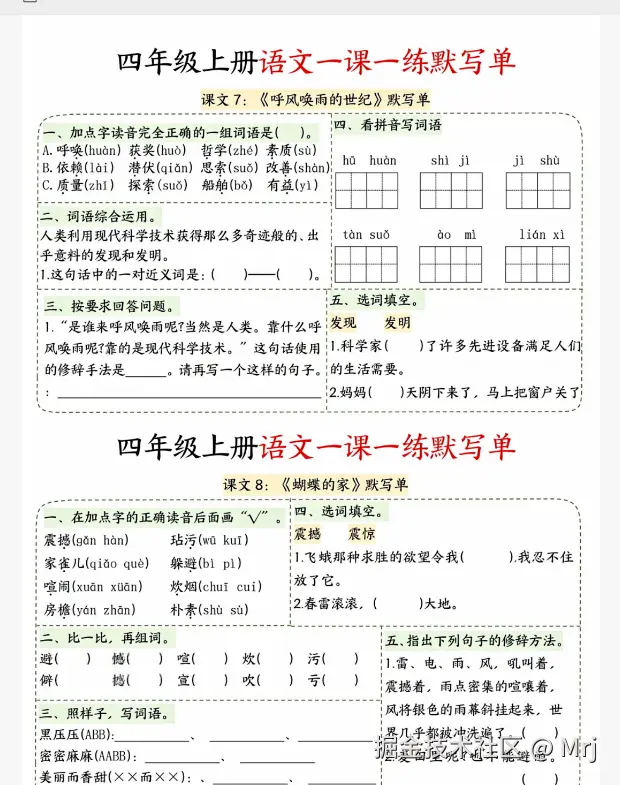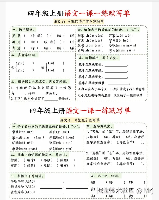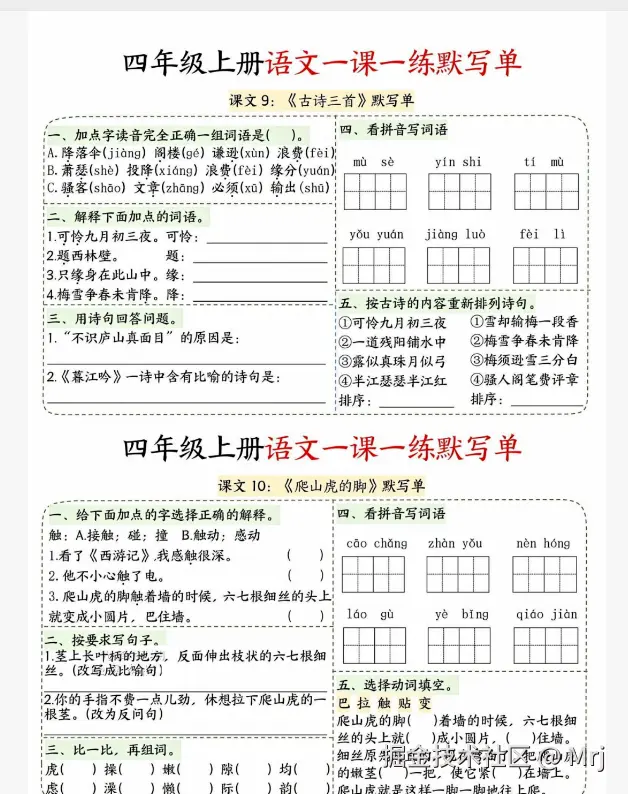 人教版四年级上册语文《每课一练默写单》,含答案共22页,电子版可下载,这套四上语文一课一练小纸条,包含了每篇课文的看拼音写词语、词语补充、句子练习、按课文内容填空等内容,帮助孩子巩固所学内容,提升语文学习水平。需要的家长抓紧打印出来让孩子练一练吧!