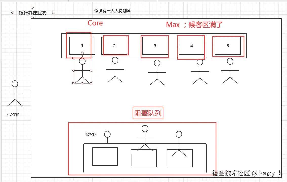 - 如果工作队列满了,然后也已经达到最大线程数了,这时候来任务会执行拒绝策略。