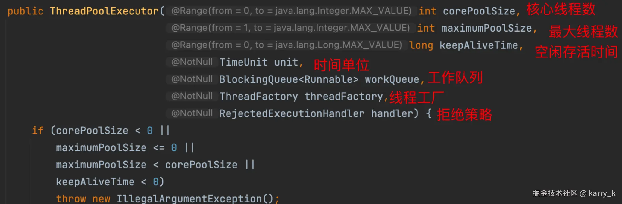 他的几个关键配置包括:核心线程、最大线程数、空闲存活时间、工作队列、拒绝策略