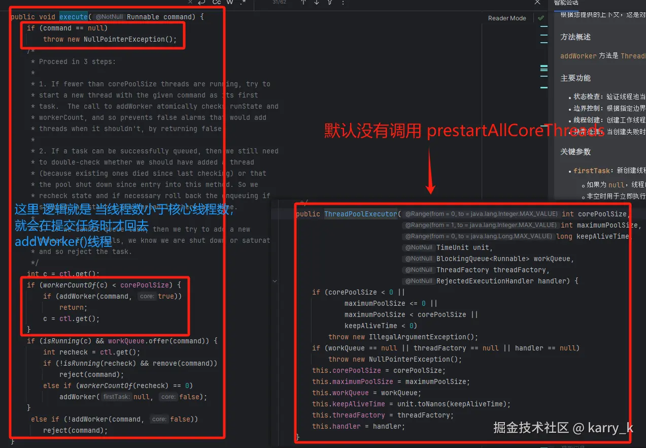 - 默认情况下线程不会预创建,任务提交之后才会创建线程(不过设置 prestartAllCoreThreads 可以预创建核心线程)。