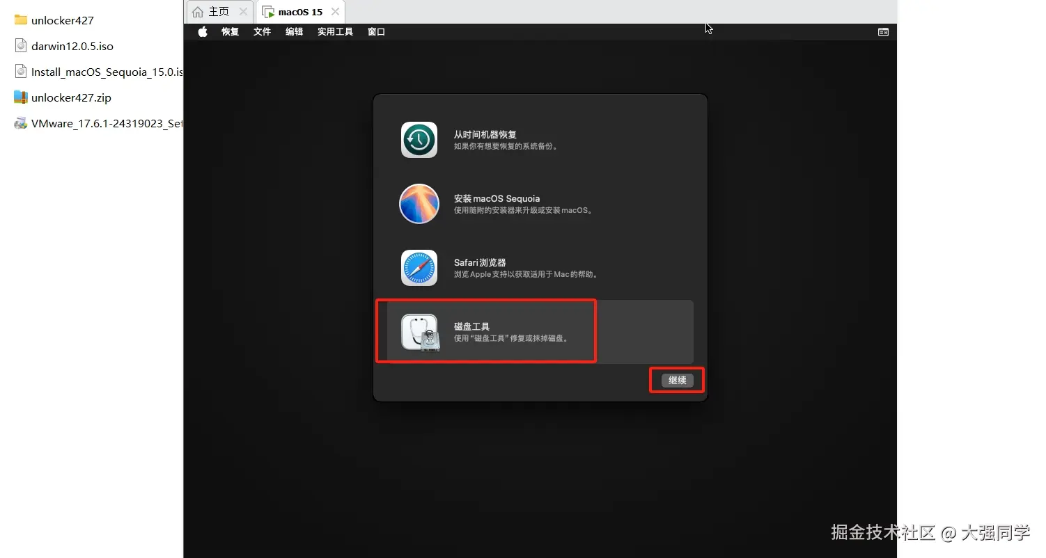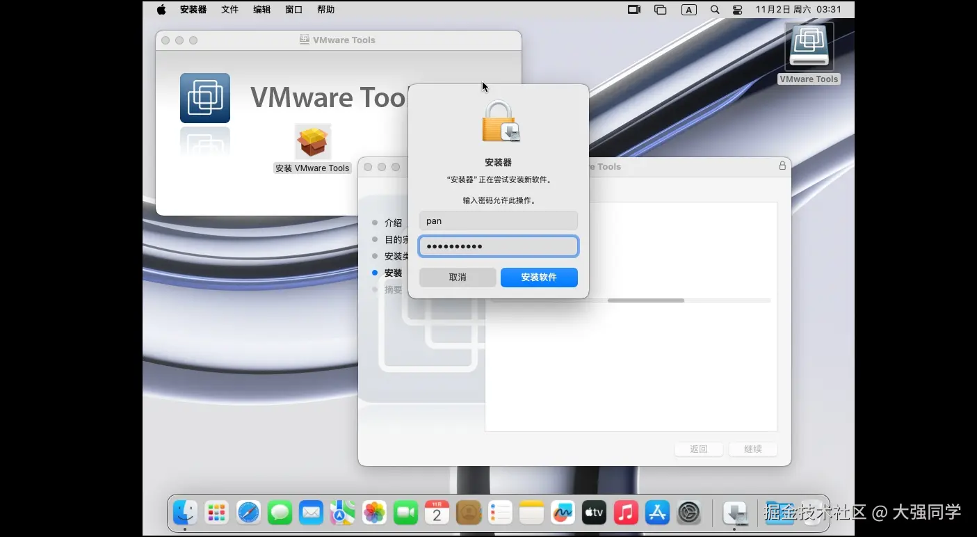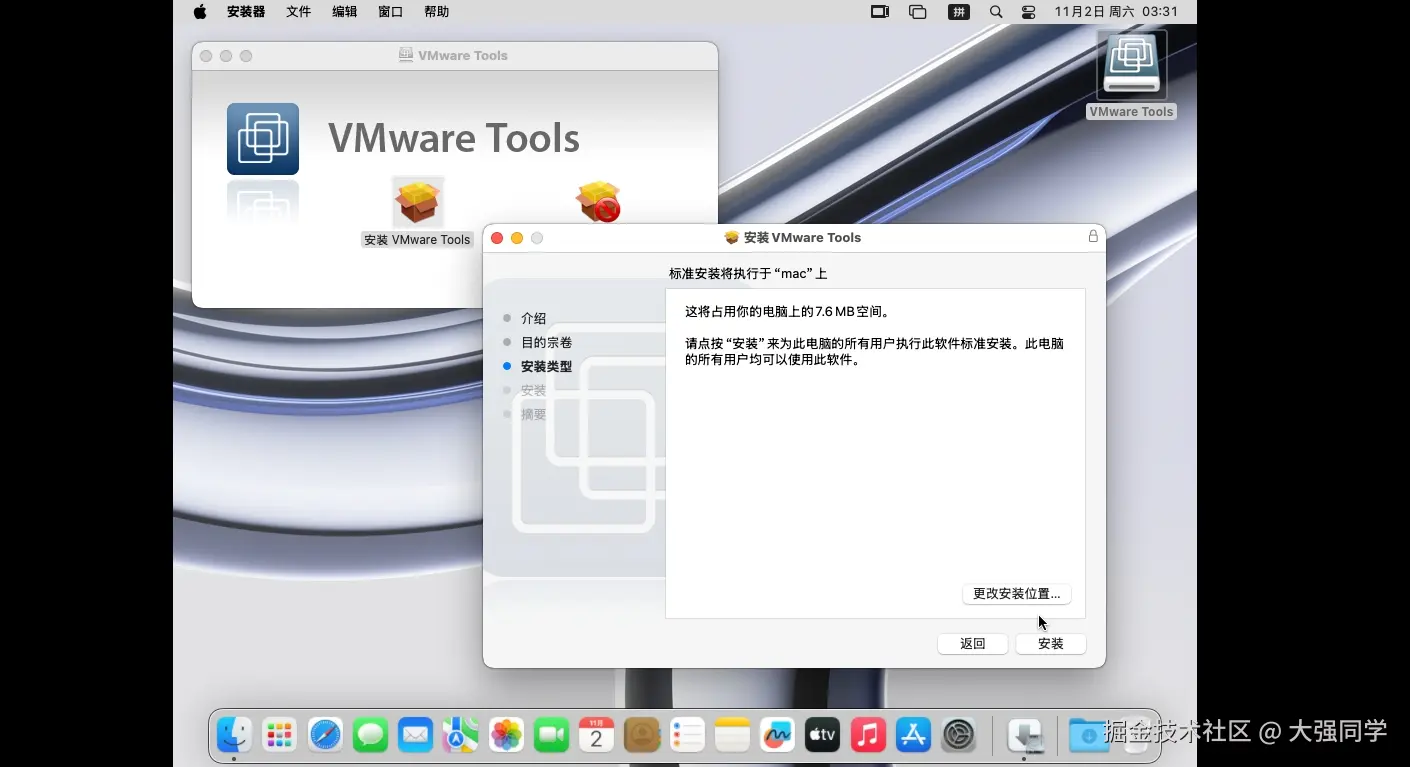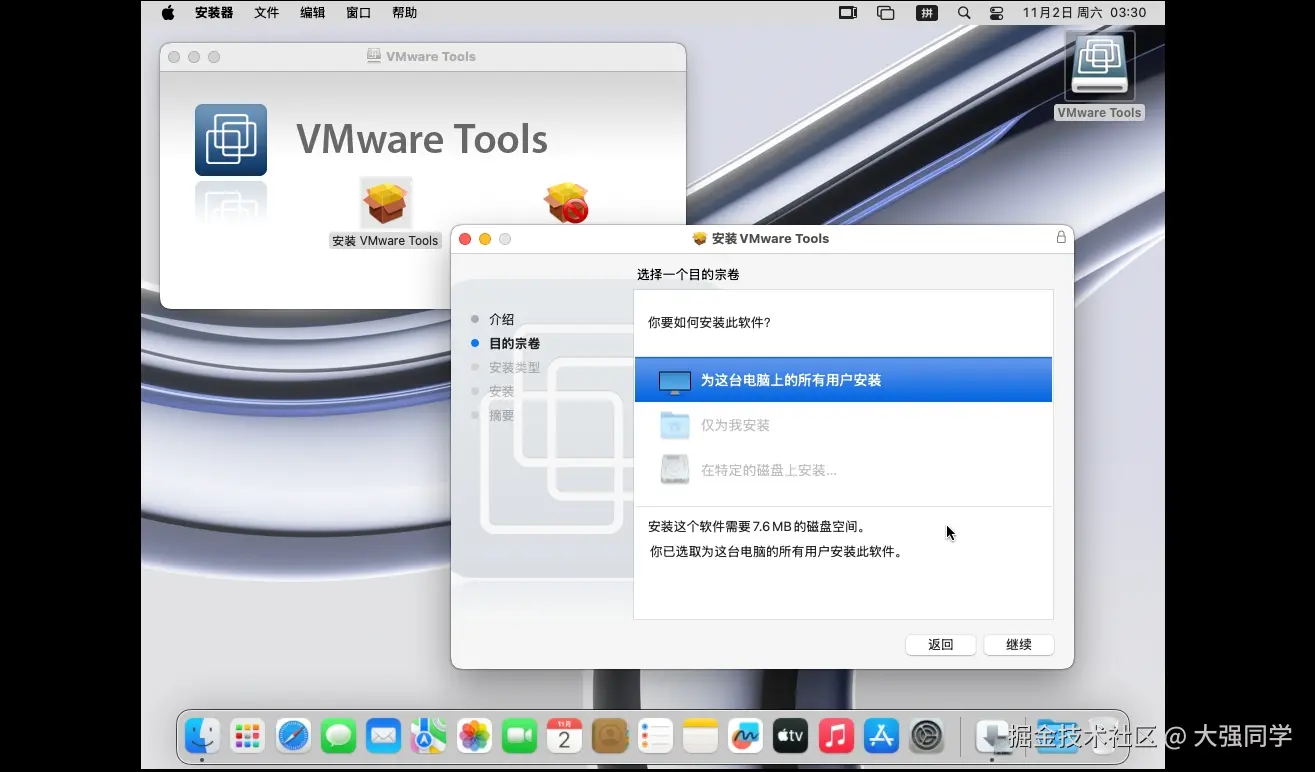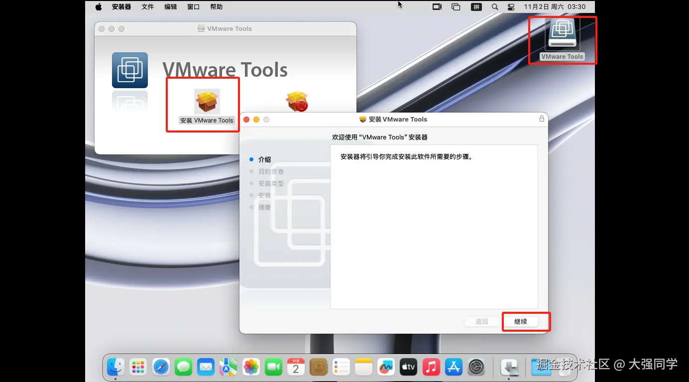 现在再次启动虚拟机,进入macOS之后,发现桌面右上角已经加载了“VMware Tools”了,双击打开它,再双击“安装VMware Tools”按钮就可以启动安装向导了,第一个界面就点击“继续”按钮
