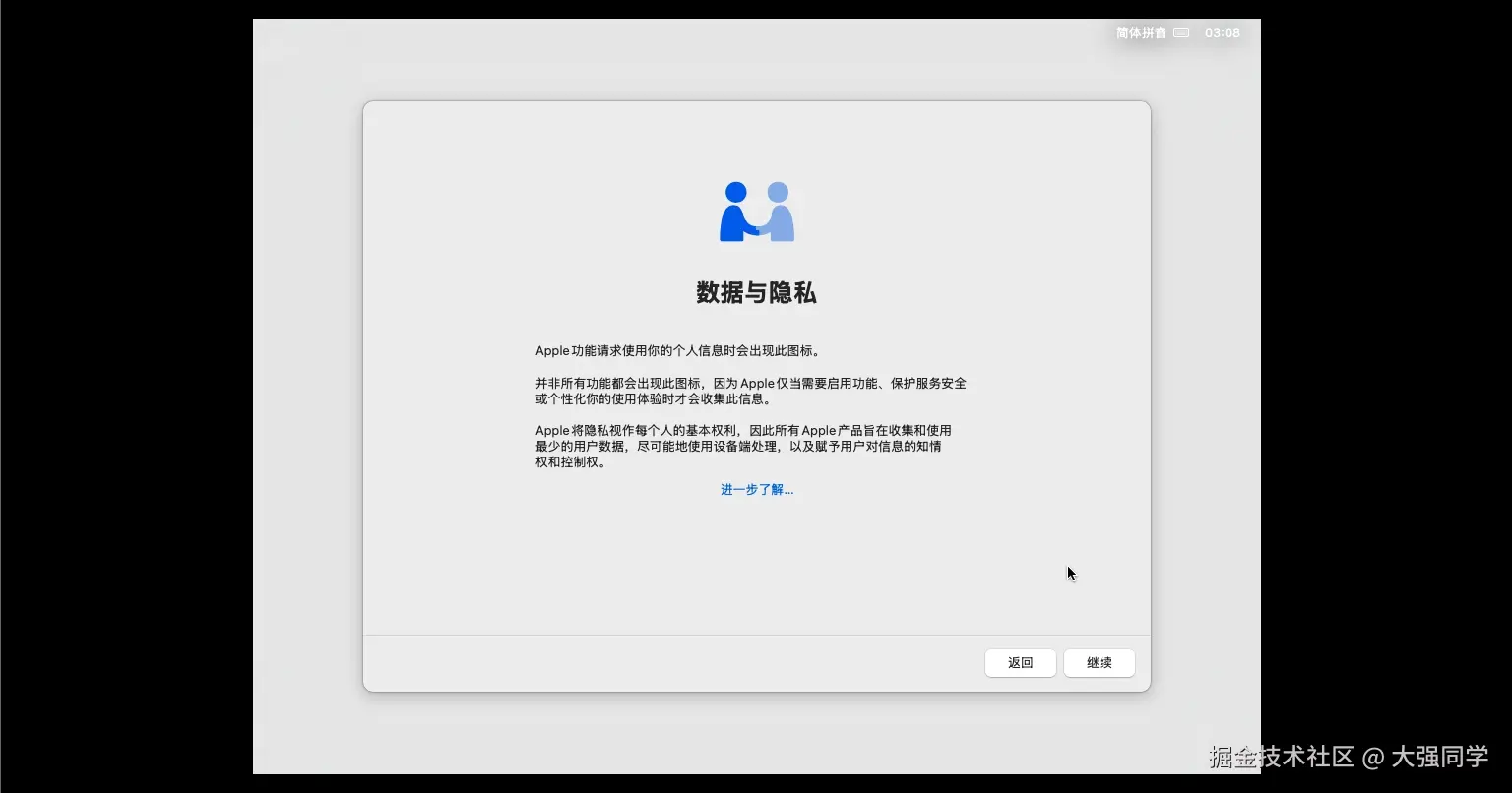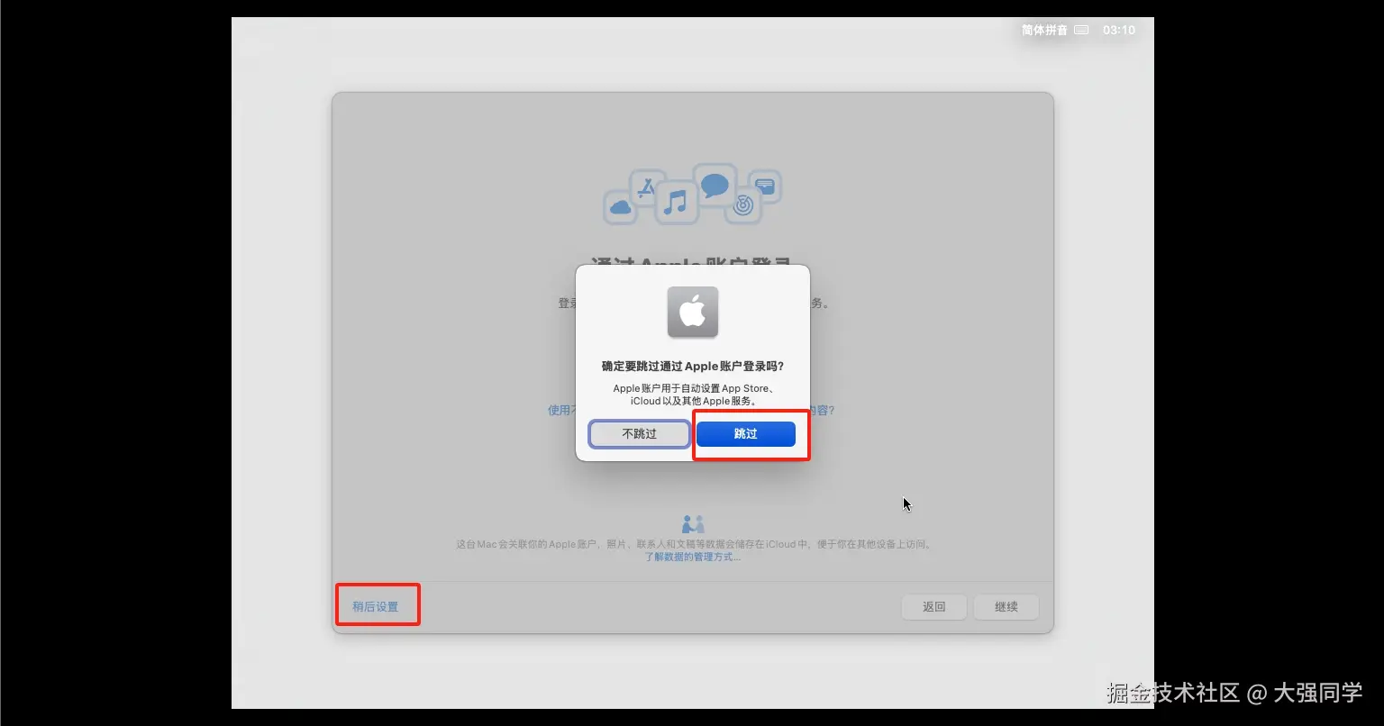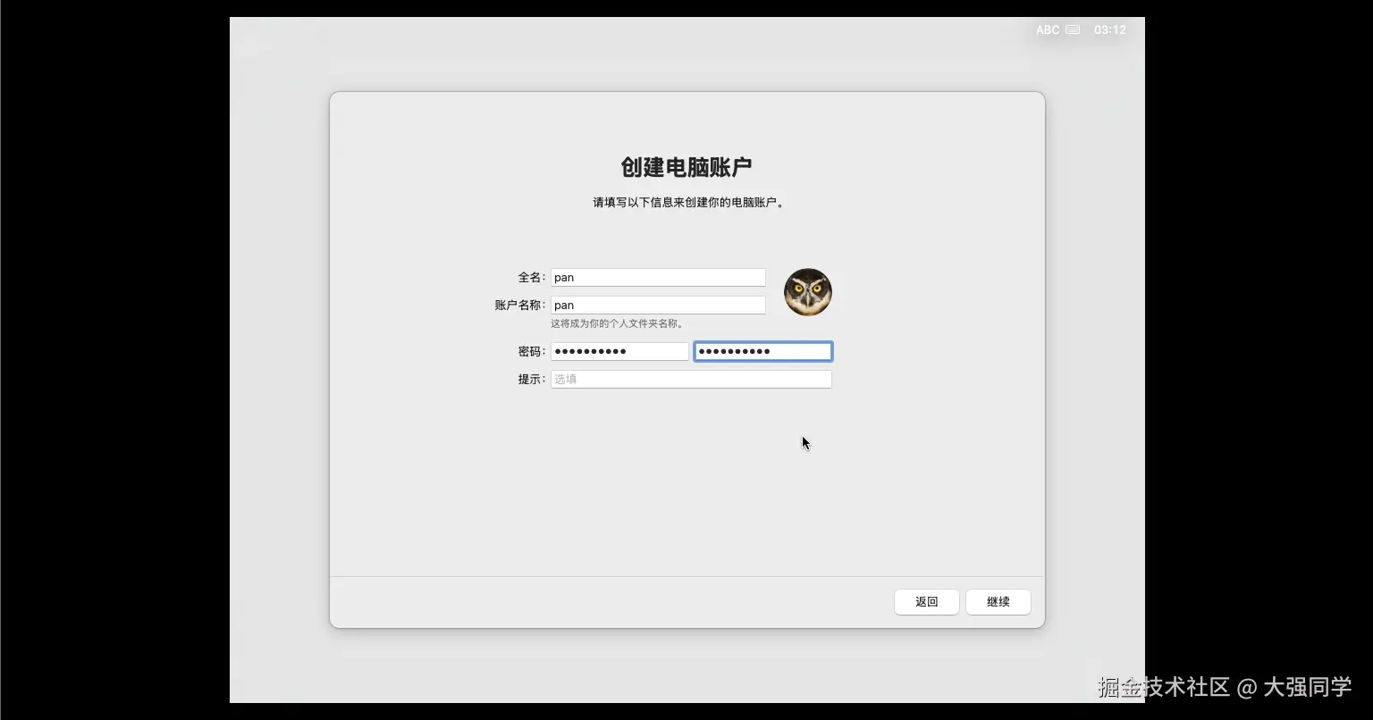 因为我们前面没有登录Apple账户,所以这里需要创建一个本地账户,建议用户名使用纯英文字符