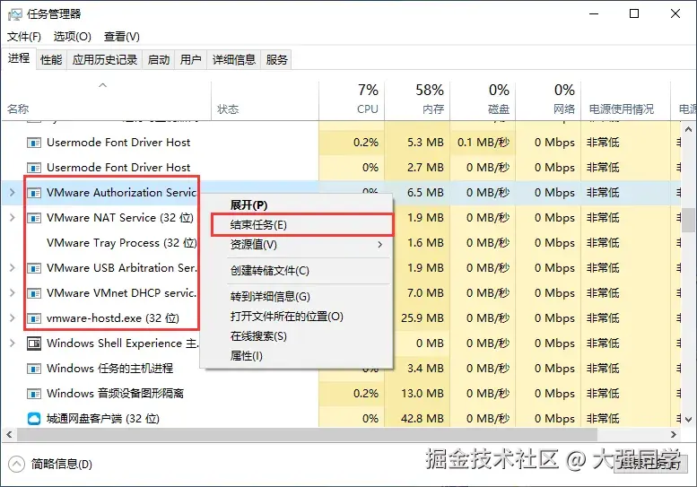 打开Windows系统的任务管理器,在进程里,把带VM开头的进程全部“结束任务”