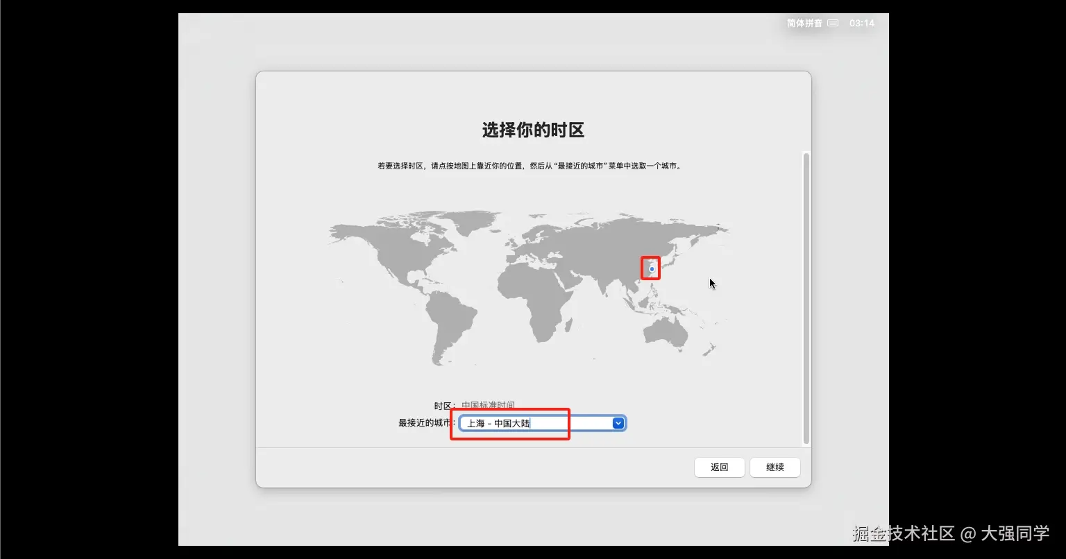选择时区,你可以用鼠标点击那个地图,比如我这里点击了上海,时区会影响时间的显示,所以得选对了(当然后面我也会讲如何修改时区)