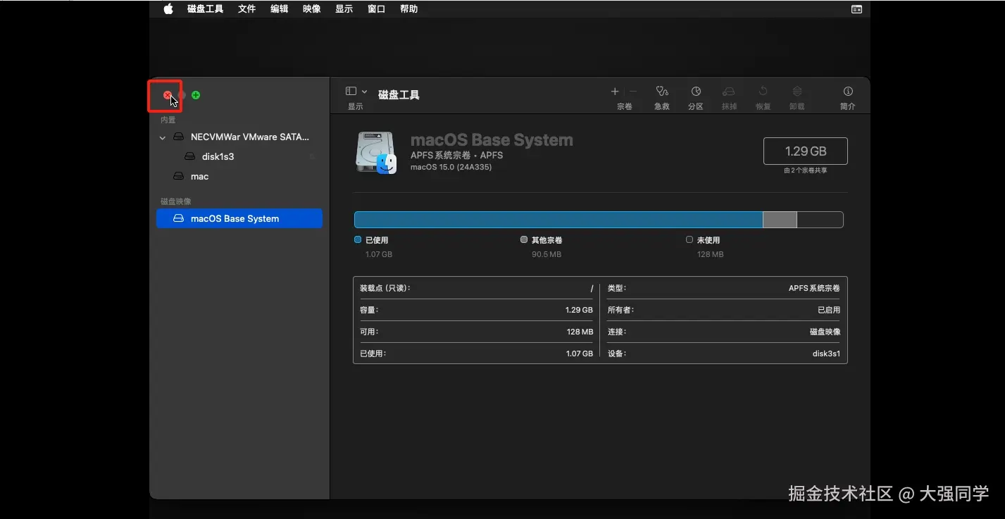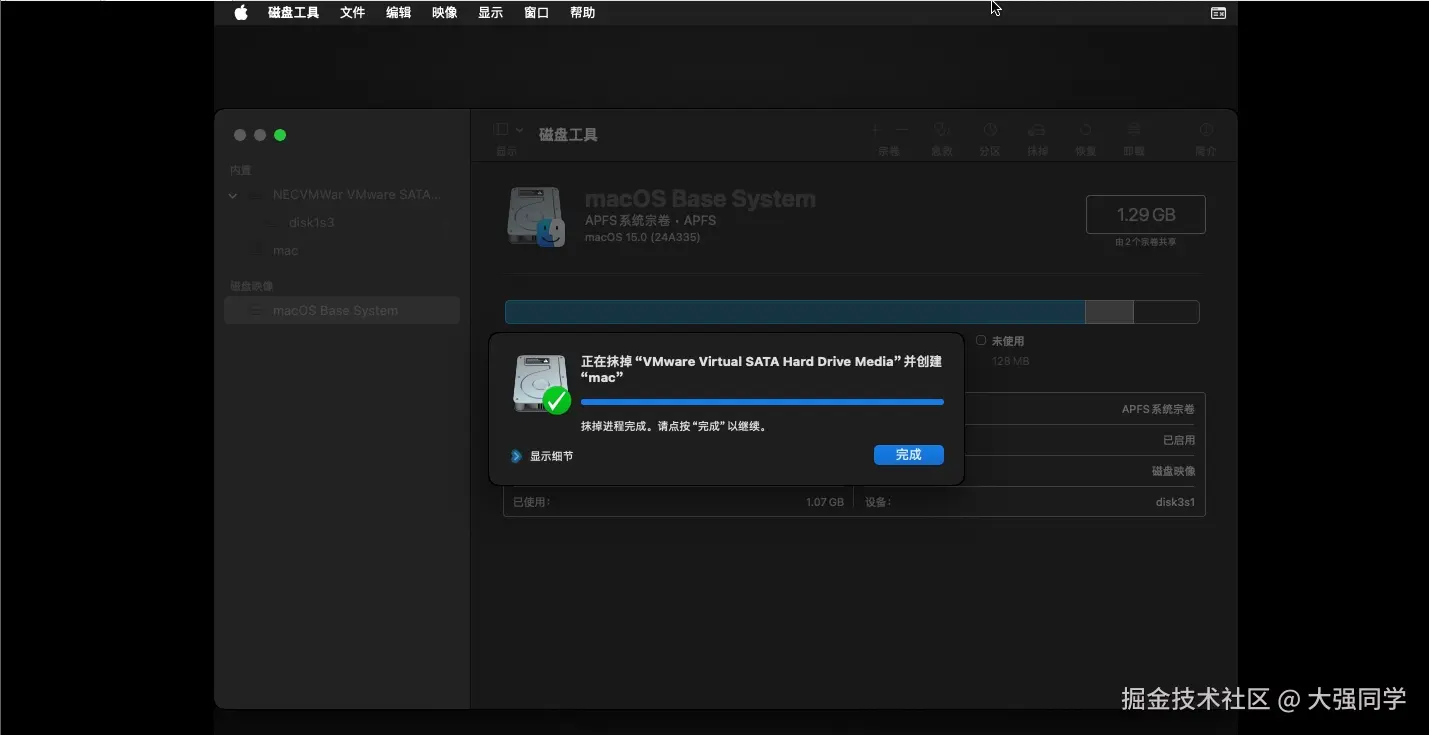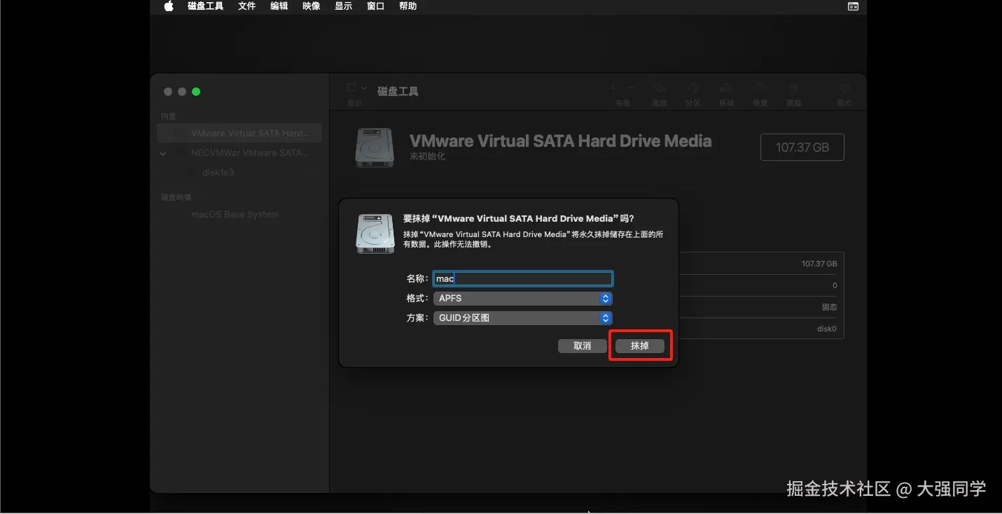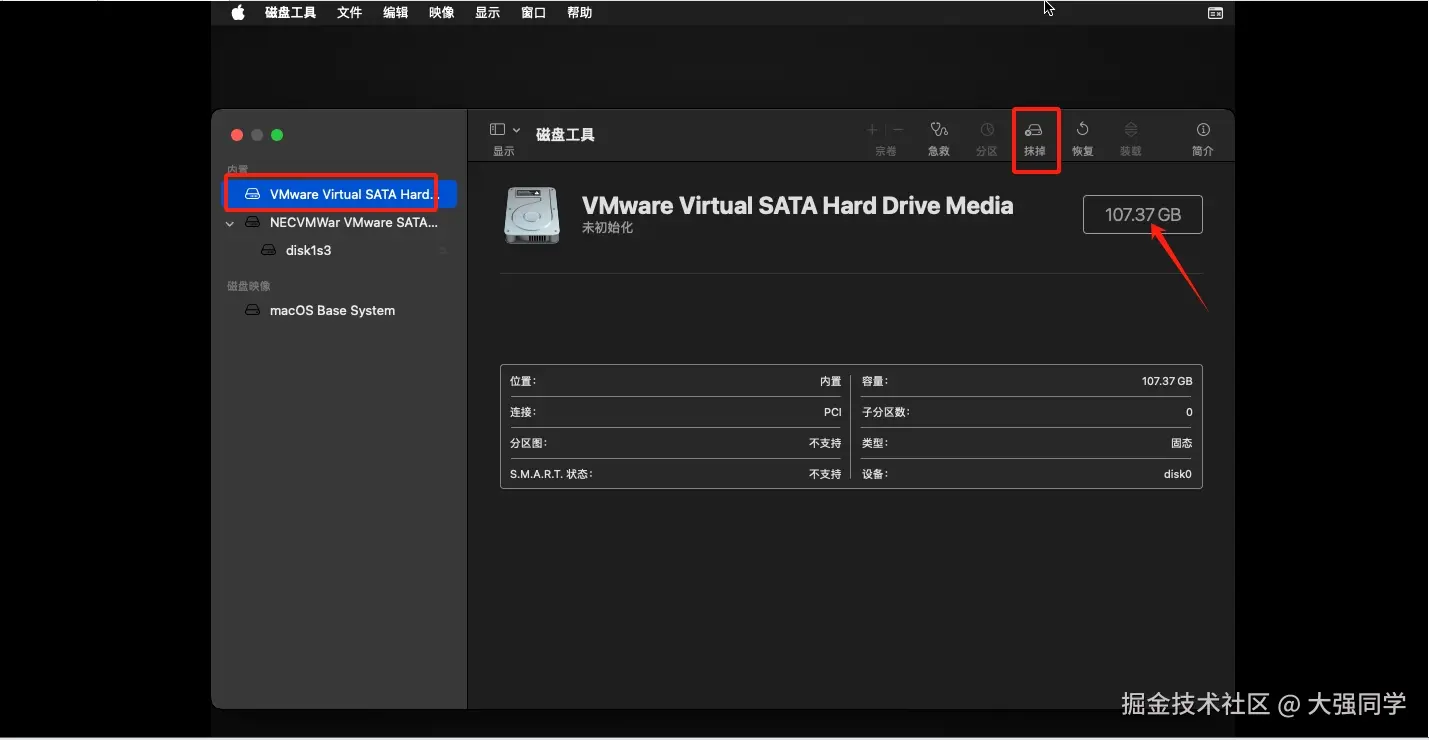 左边可能会列出多个挂载磁盘,一般最上面的那个写着“VMware Virtual”字样的就是虚拟机分配的磁盘了,你也可以根据它显示的磁盘大小进行判断。选中虚拟机的磁盘之后,直接点击“抹除”按钮