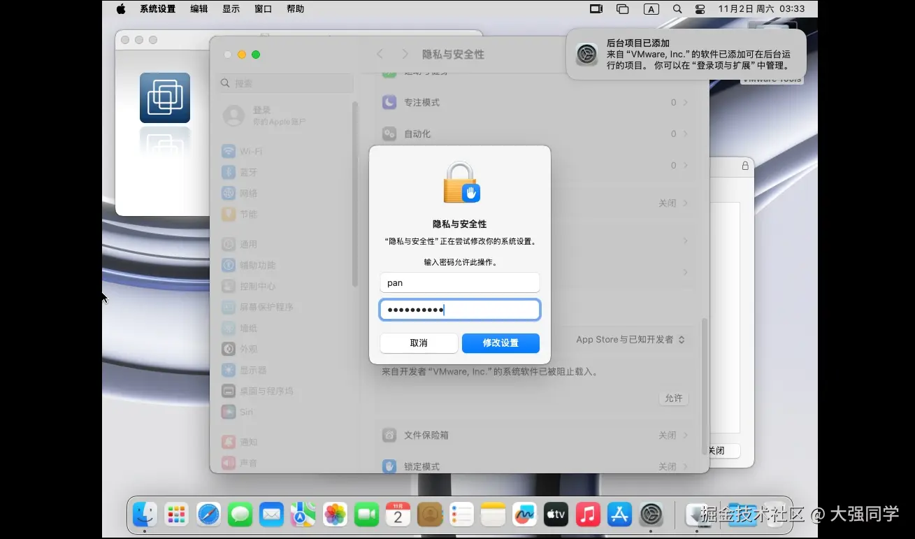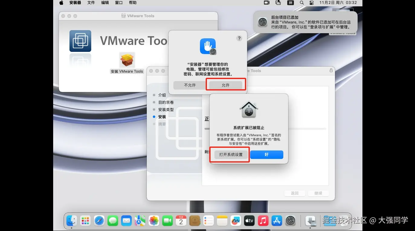 如果安装过程出现各种提示,肯定都是选择“允许”。还有就是,可能会提示“系统扩展已被阻止”,那就点击“打开系统设置”按钮