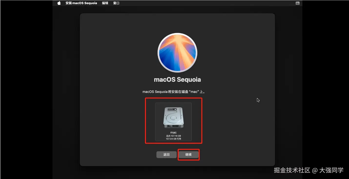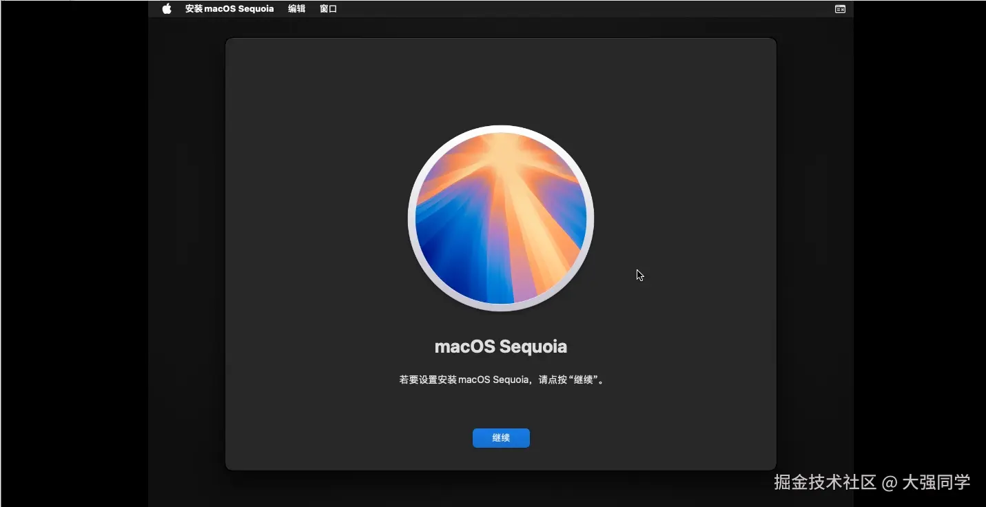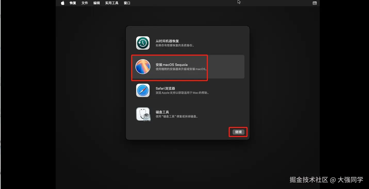 现在可以选择“安装macOS Sequoia”选项,再点击“继续”按钮