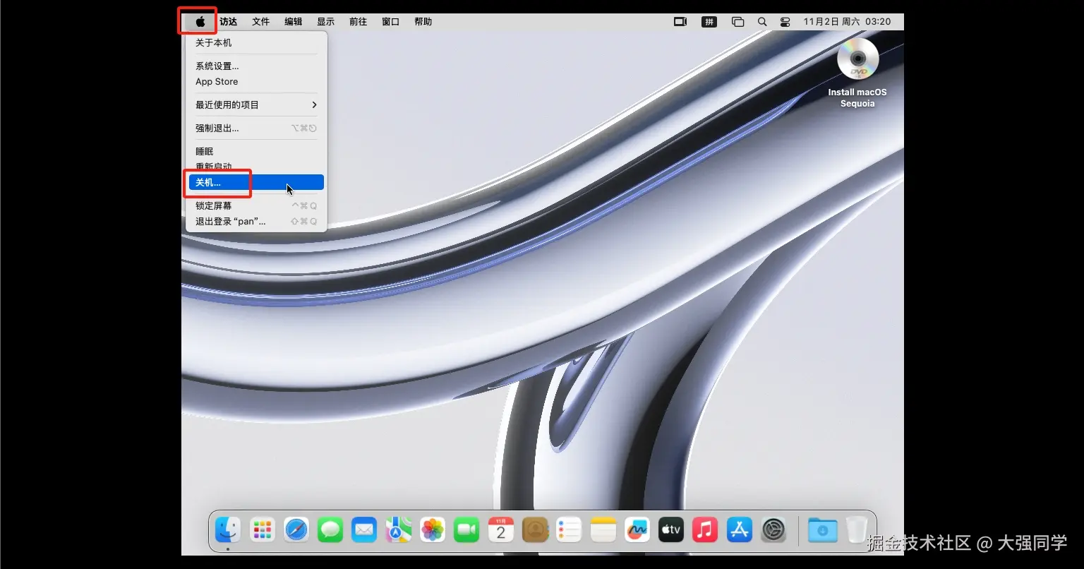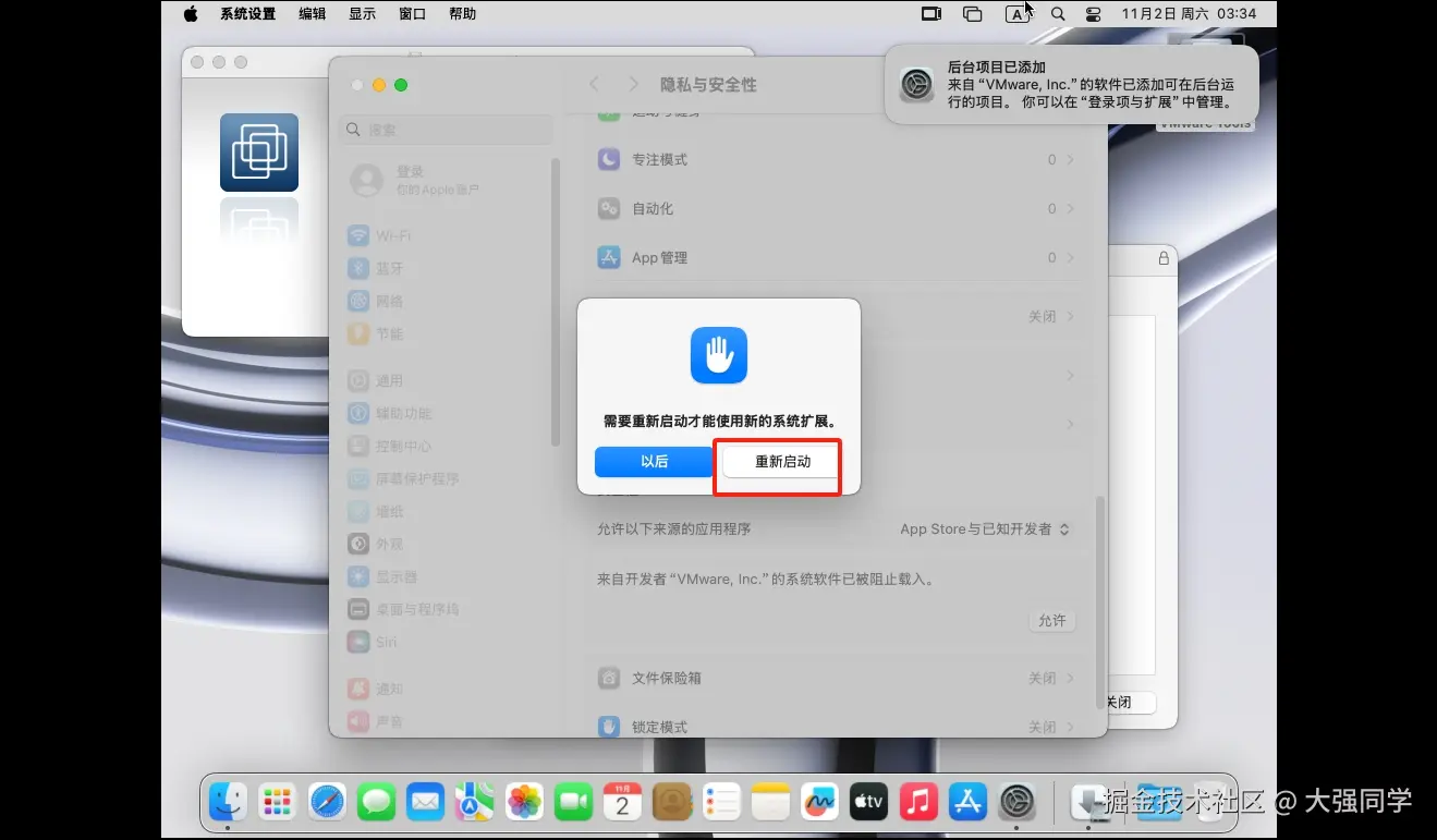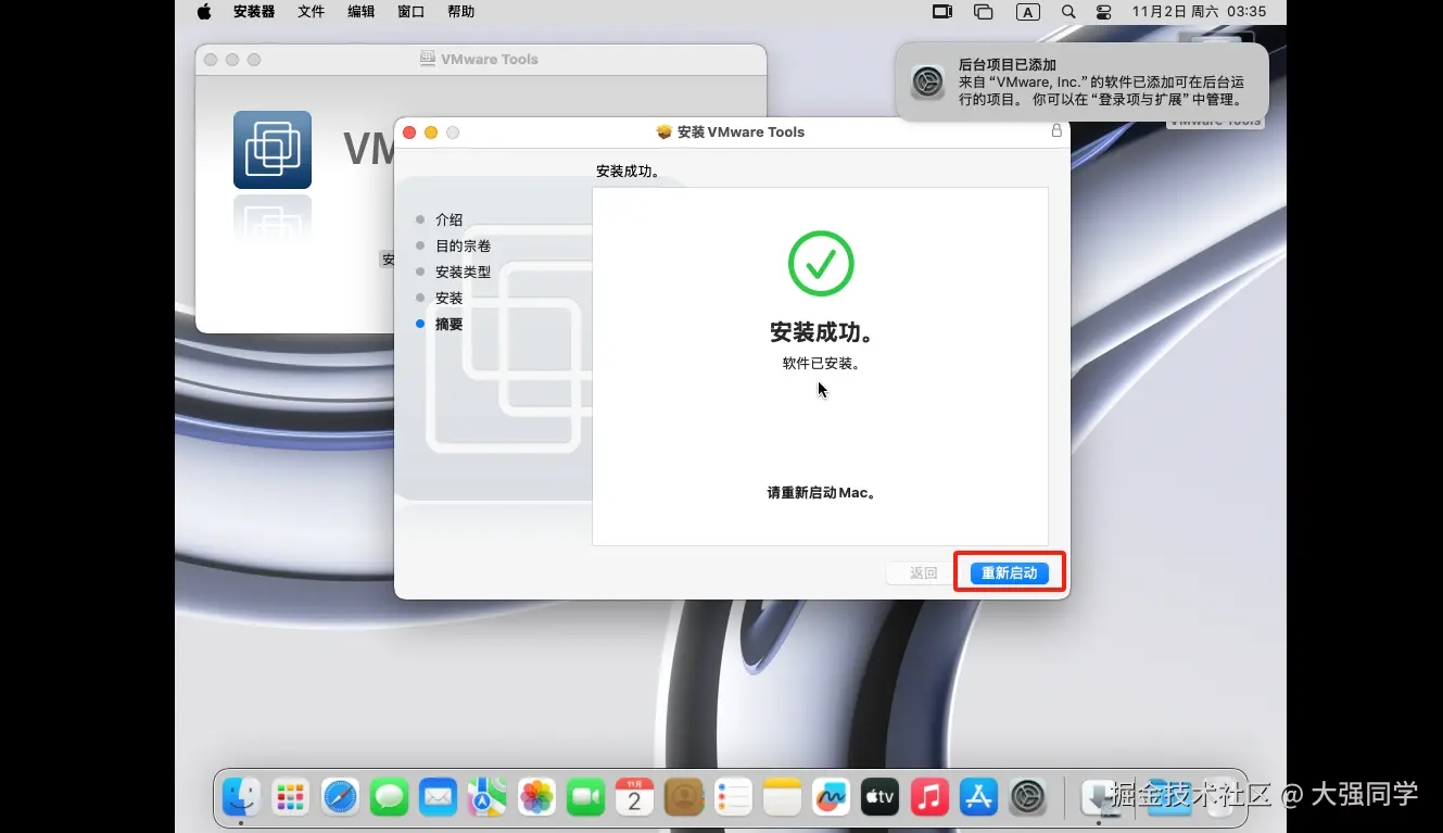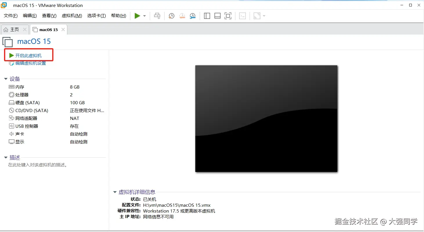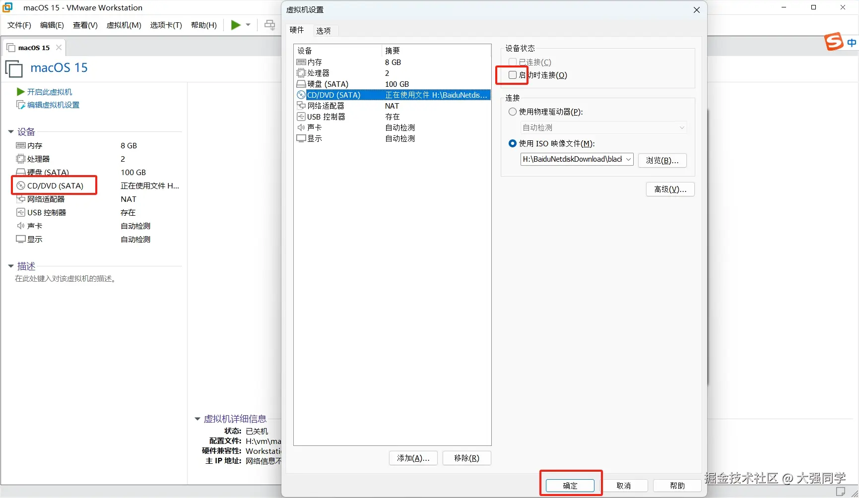如果你不点“重新启动”按钮,你也可以自己手动关机,然后再打开虚拟机设置这里,把“CD/DVD(SATA)”这里的“启动时连接”这个选项取消勾选,不然它每次进入macOS都会加载指定的镜像
