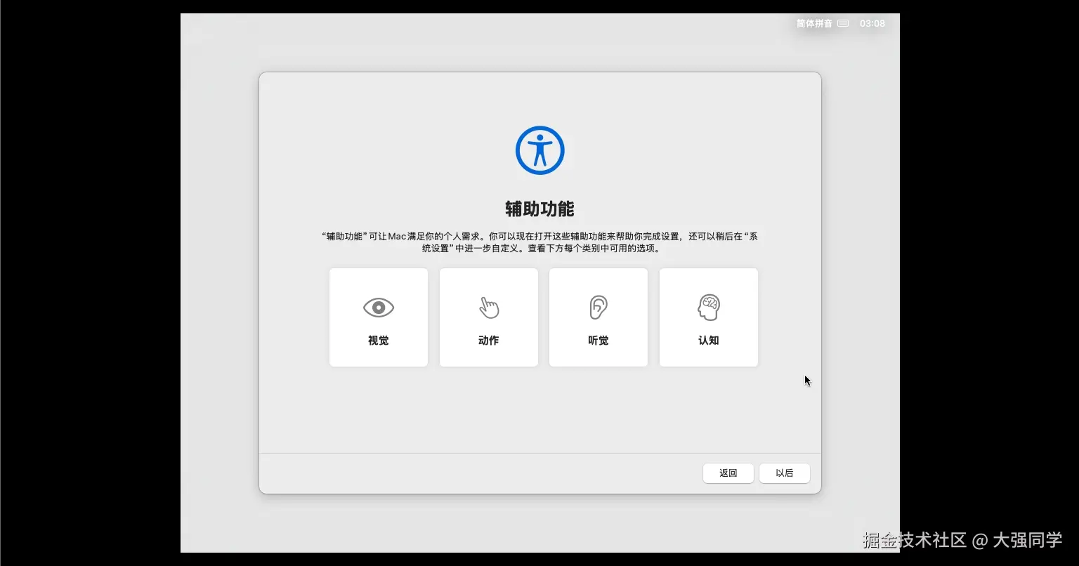 辅助功能可以先不开启(开启就更卡了),直接点击“以后”按钮