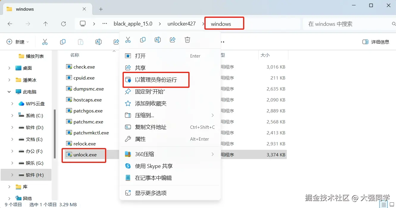 解压得到的文件中有个“windows”文件夹,该文件夹里面有个“unlock.exe”文件,选中它,右键,以管理员身份运行