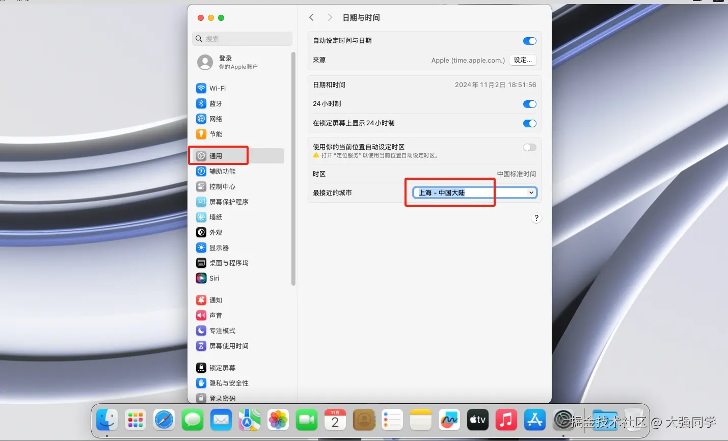 可能有些同学会发现macOS显示的时间不对,那可能是之前的时区没有选对,你可以打开系统设置,在“通用”里面找到“最接近的城市”,把它改为中国的城市就行