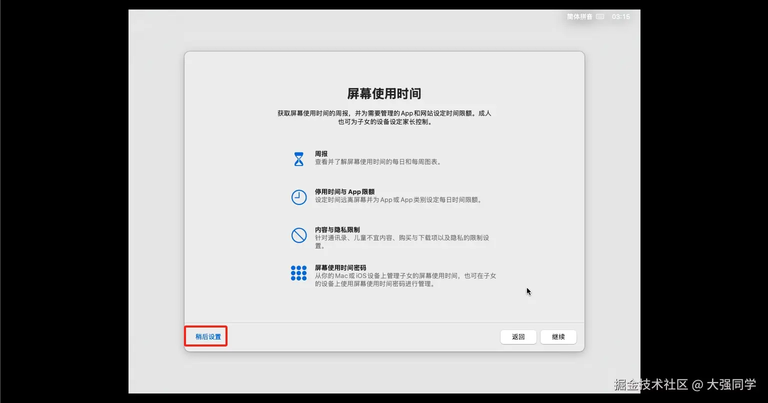 屏幕使用时间,为了节省性能资源,建议先不要开启,直接点击“稍后设置”按钮