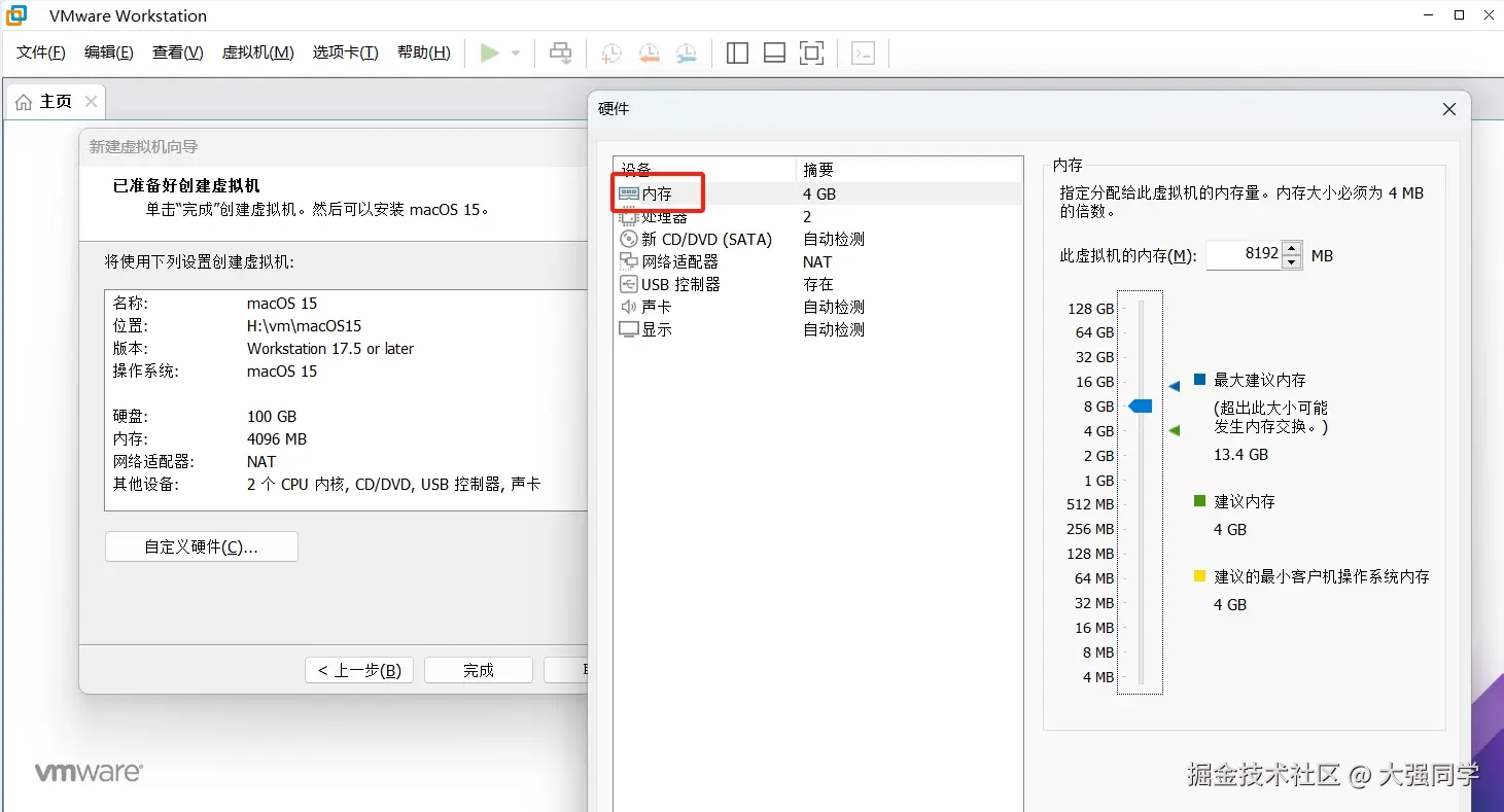 虽然基本设置都弄好了,但是我们还是要点击“自定义硬件”按钮。首先是设置内存(指的是运行内存,不是硬盘存储空间),它默认是设置4G,但是我的电脑运行内存比较大,所以我给它8G。这个内存设置得越大,你的macOS就越流畅,但是你的宿主机就会越卡,你可以根据自己的实际情况进行分配