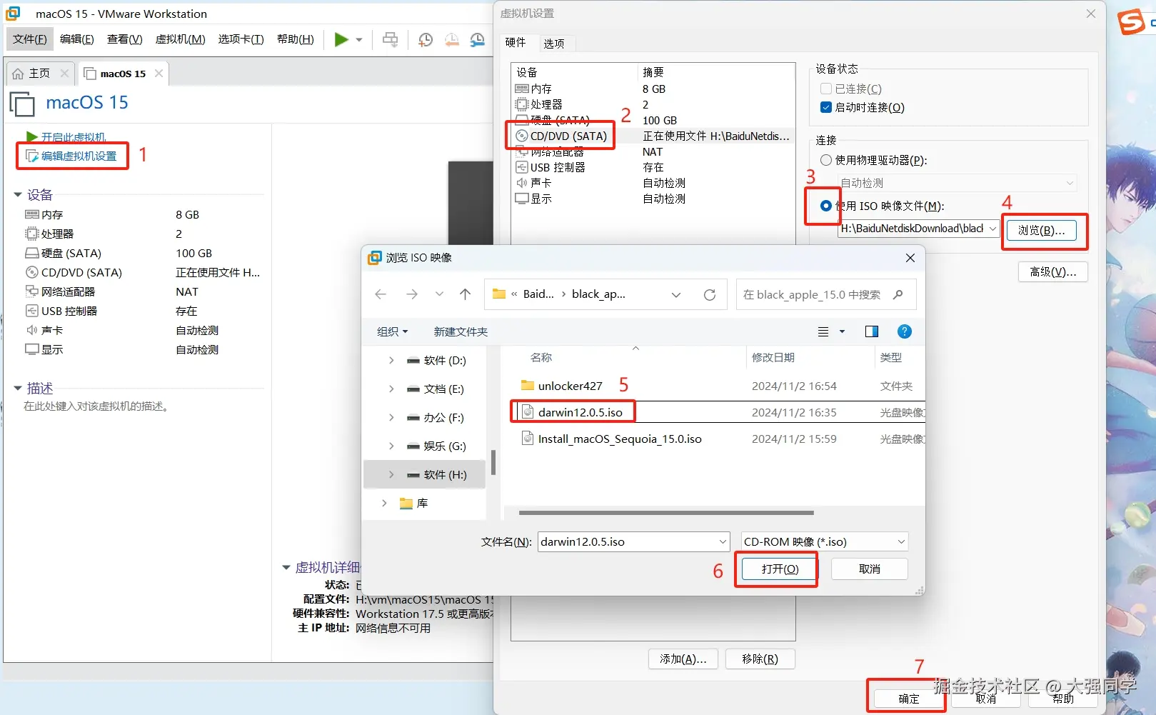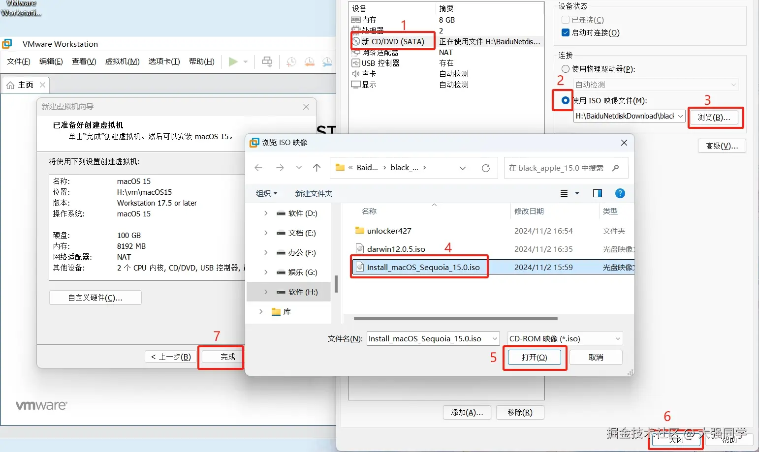 现在点击“新CD/DVD(SATA)”选项,然后点击“使用ISO镜像文件”,点击“浏览”按钮,选中之前下载好的苹果镜像文件(也就是Install_macOS_Sequoia_15.0.iso),之后关闭自定义面板,再点击“完成”即可。可能我描述得不是很立体,具体操作步骤你可以参考一下我的截图