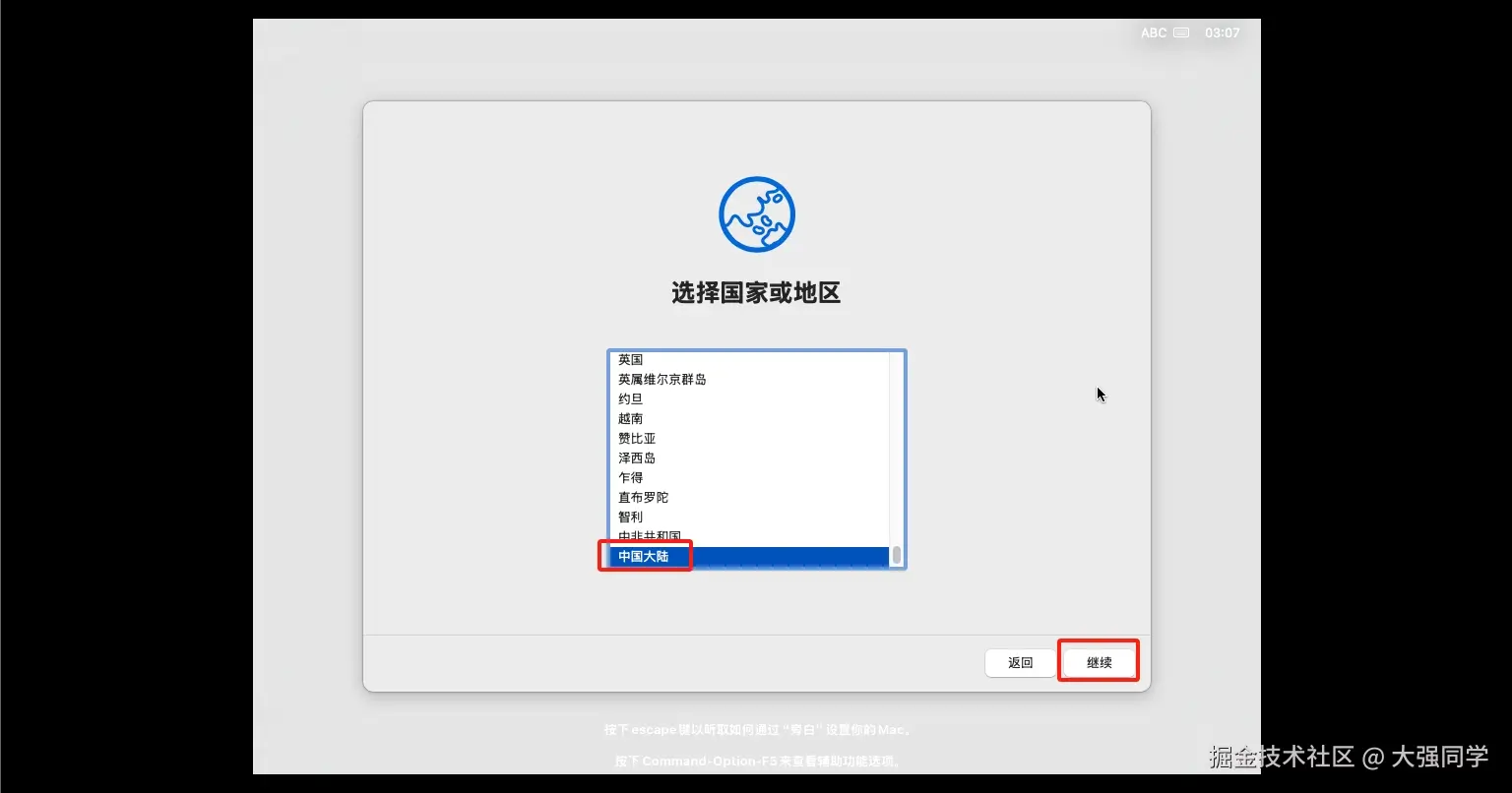 等它进度条结束之后会让你选择国家或地区,我这里选择“中国大陆”,再点击“继续”按钮