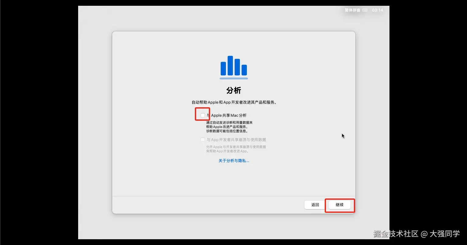 分析功能,建议取消勾选“与Apple共享Mac分析”选项,然后点击“继续”按钮