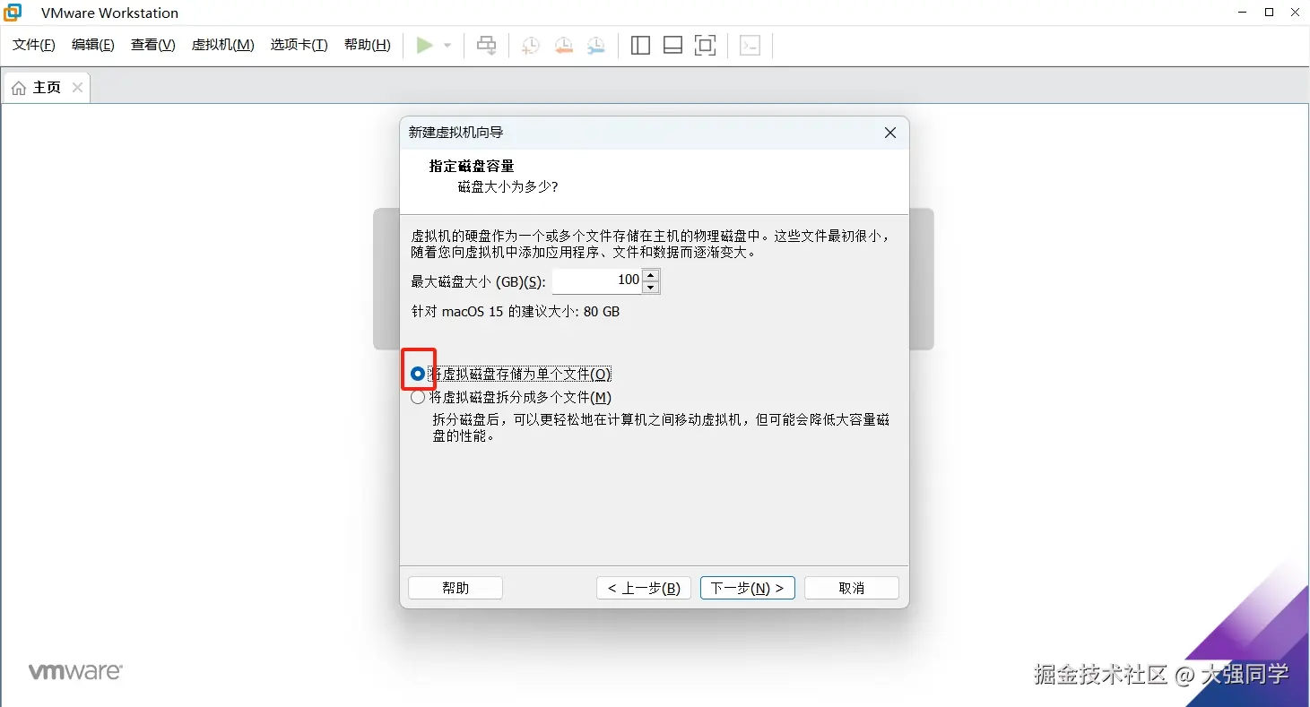 最大磁盘默认是80G,我这里把它改为了100G,建议设置大一点,放心,它不会马上占用这些空间的,占用多少取决于你以后如何使用macOS里的硬盘。但是如果你现在设置的最大空间不够大,那以后就不好扩容了。还有就是要勾选“将虚拟磁盘存储为单个文件”,这样磁盘性能会更好。都设置好之后就点击“下一步”按钮