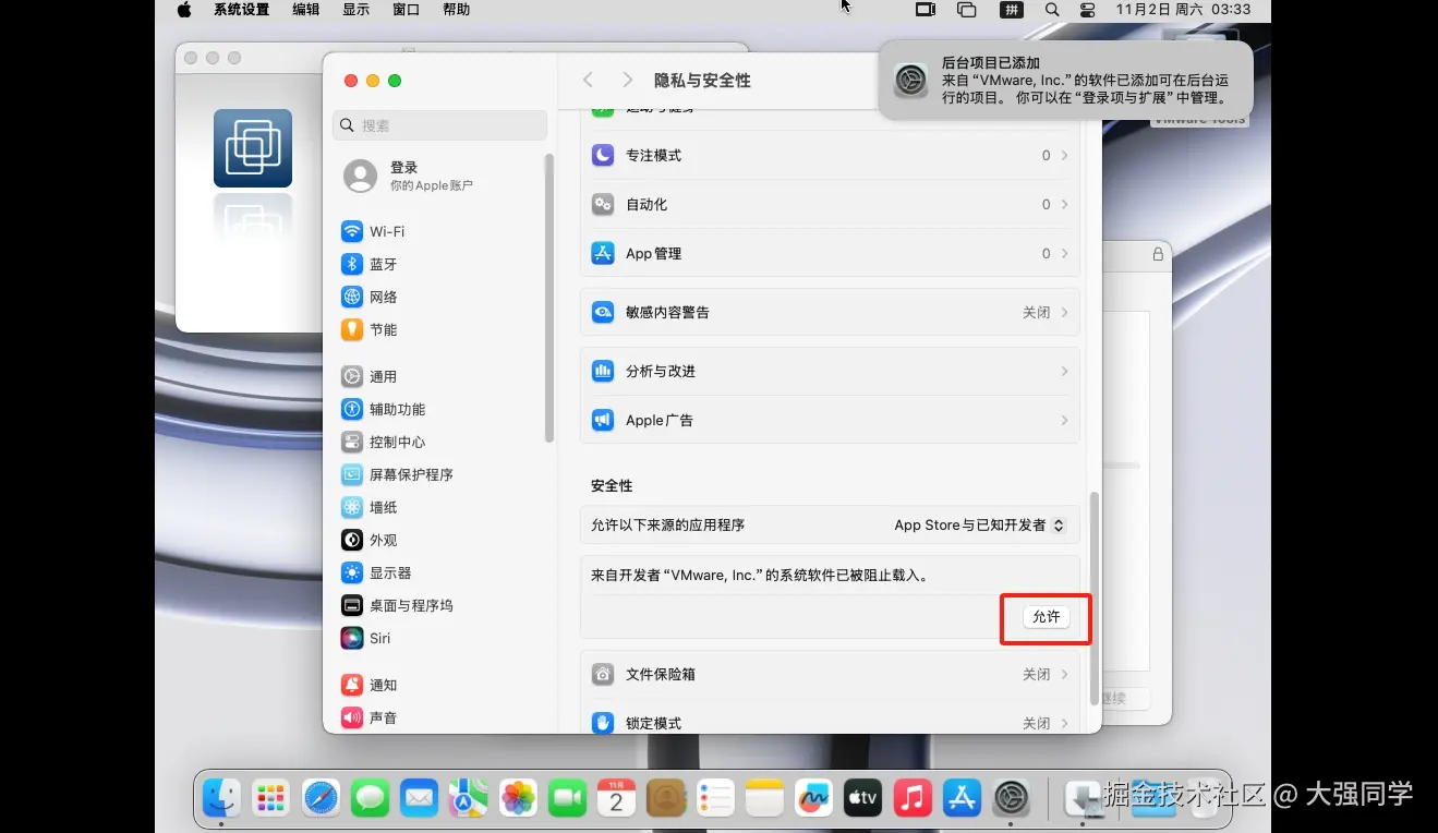 在系统的隐私与安全性这边可以看到“来自开发者XXX已被阻止载入”(可以参考一下我的截图),那我们要点击“允许”按钮