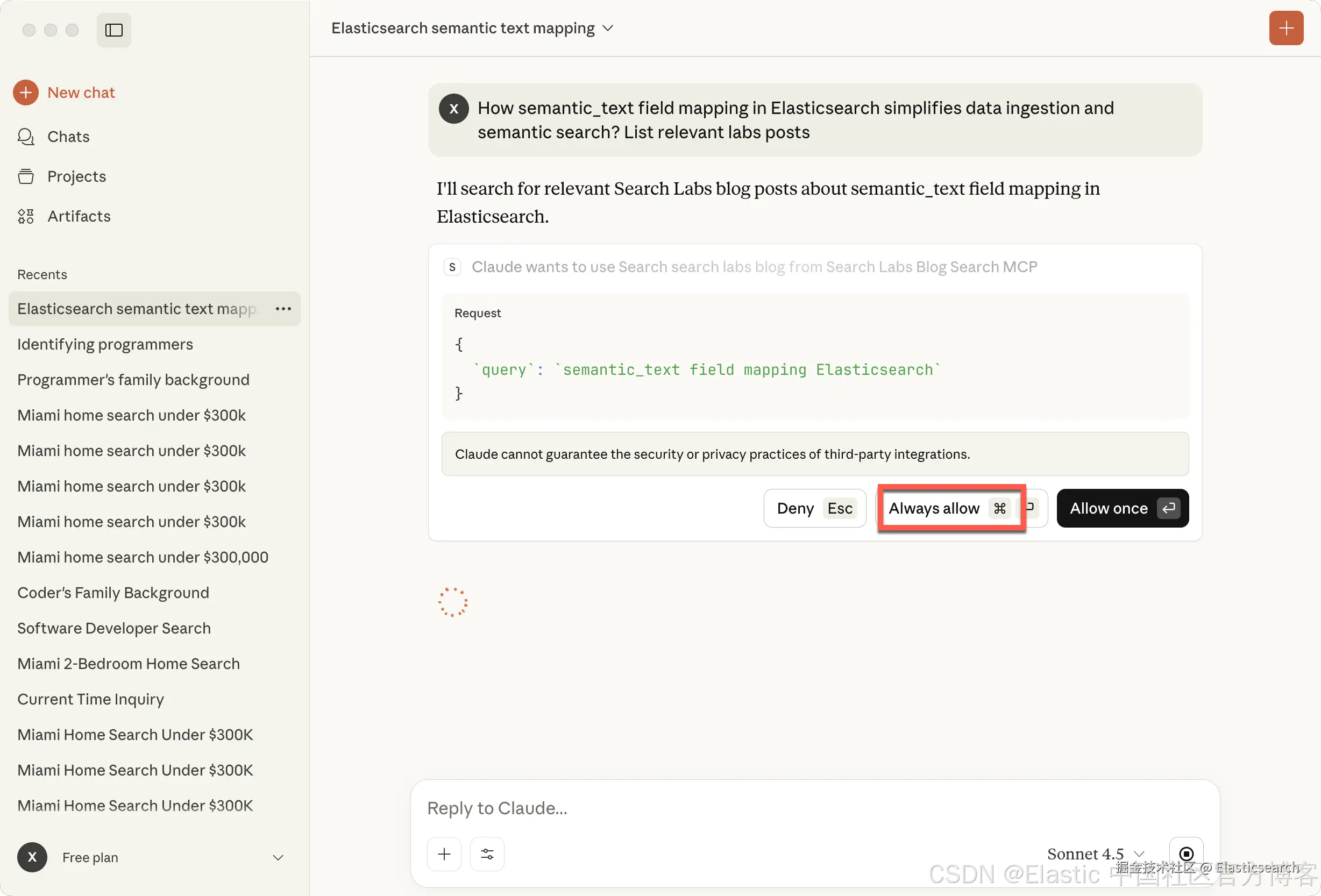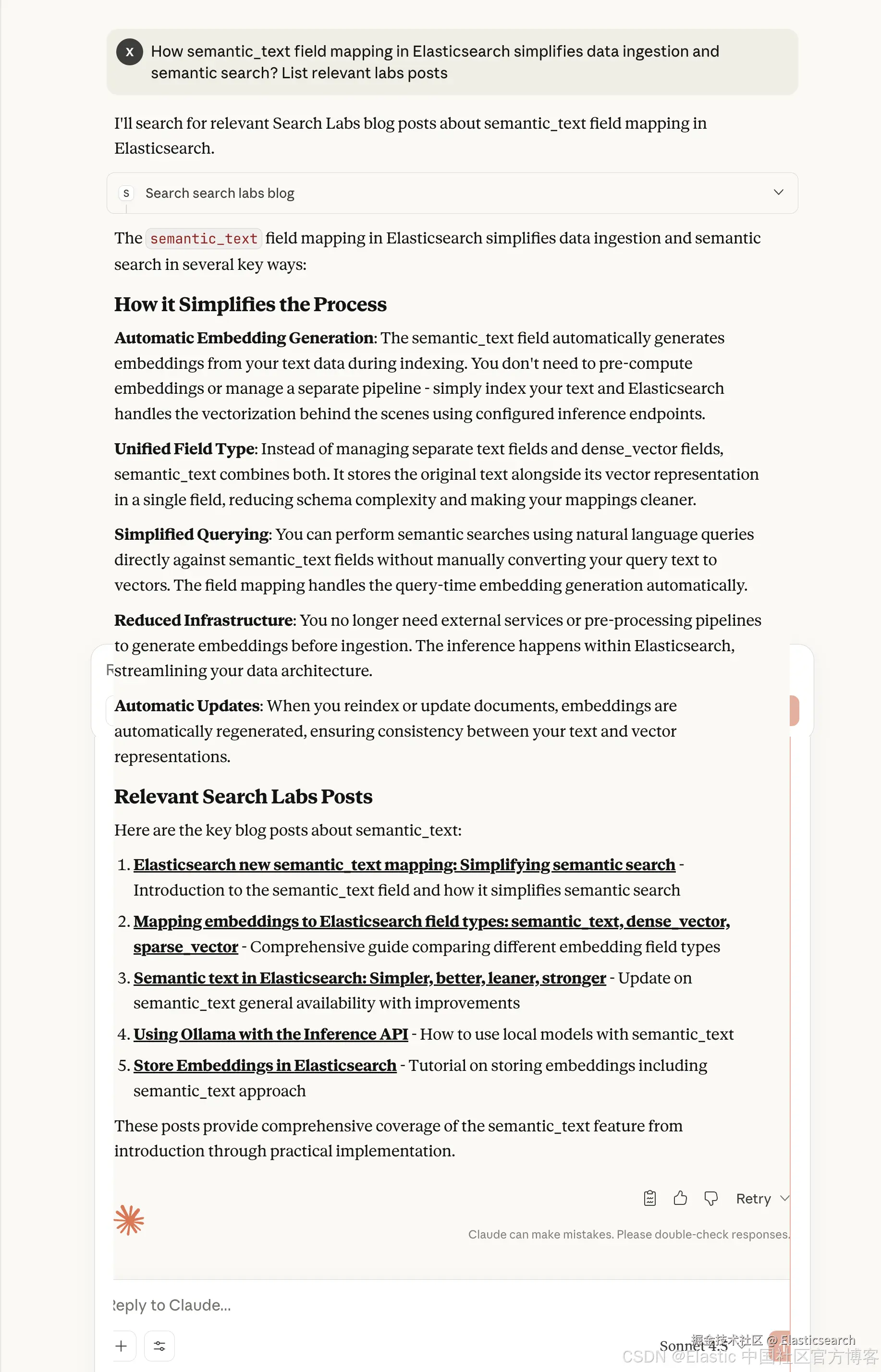下面是 Claude 动态查找关于 semantic_text 博客文章的示例:
