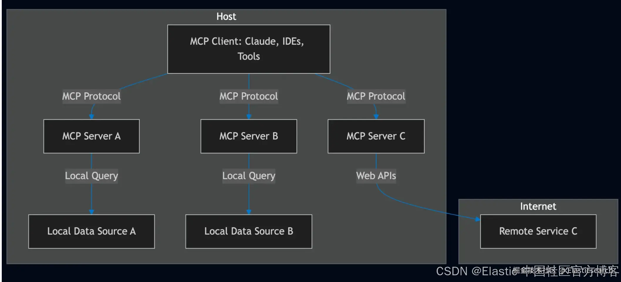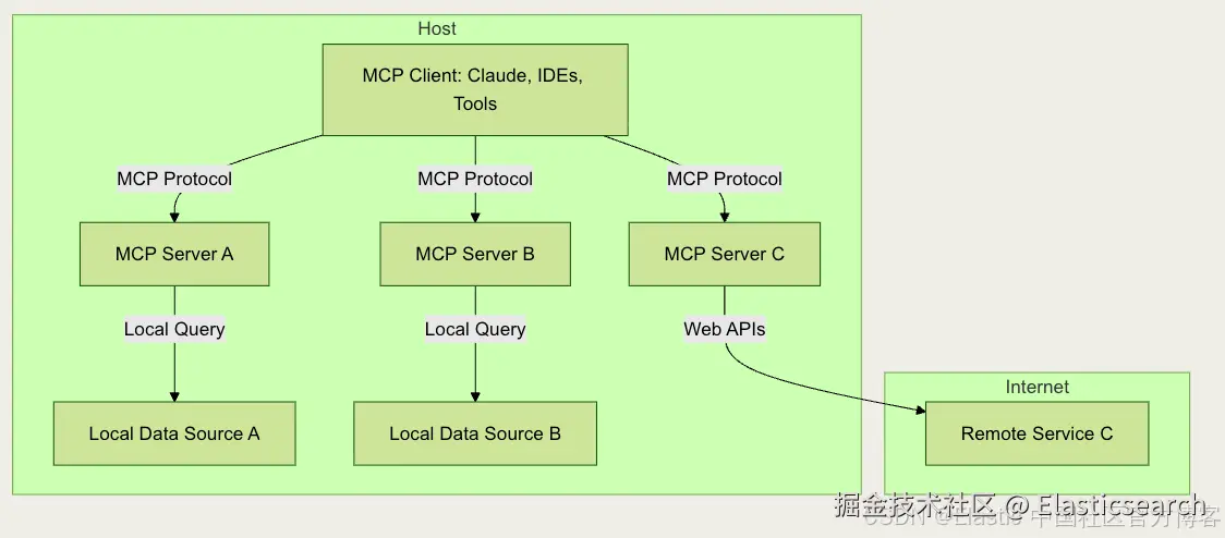 Model Context Protocol 是一个开放标准,使开发者能够在他们的数据源和 AI 驱动的工具之间建立安全的双向连接。其架构非常直接:开发者可以通过 MCP servers 暴露他们的数据,或者构建连接这些服务器的 AI 应用(MCP clients)。MCP server 充当 AI 模型与外部存储的数据之间的桥梁,例如存储在 Elasticsearch vector store 中的数据。