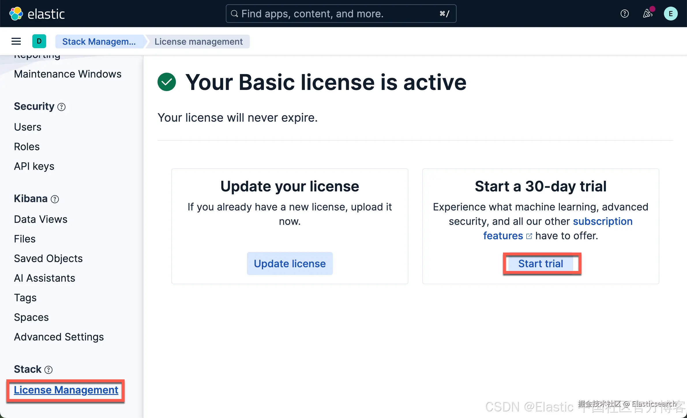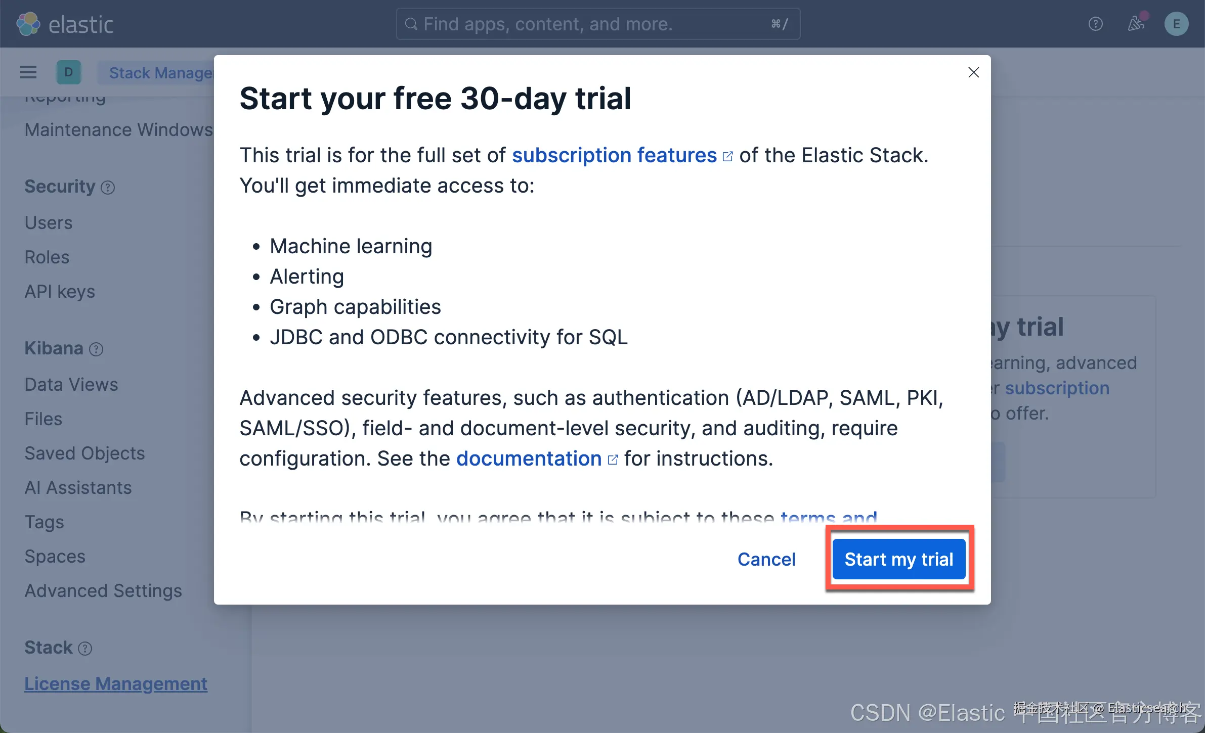 我们需要使用到内置的 ELSER 模型来向量化我们的数据。我们需要启动白金试用:
