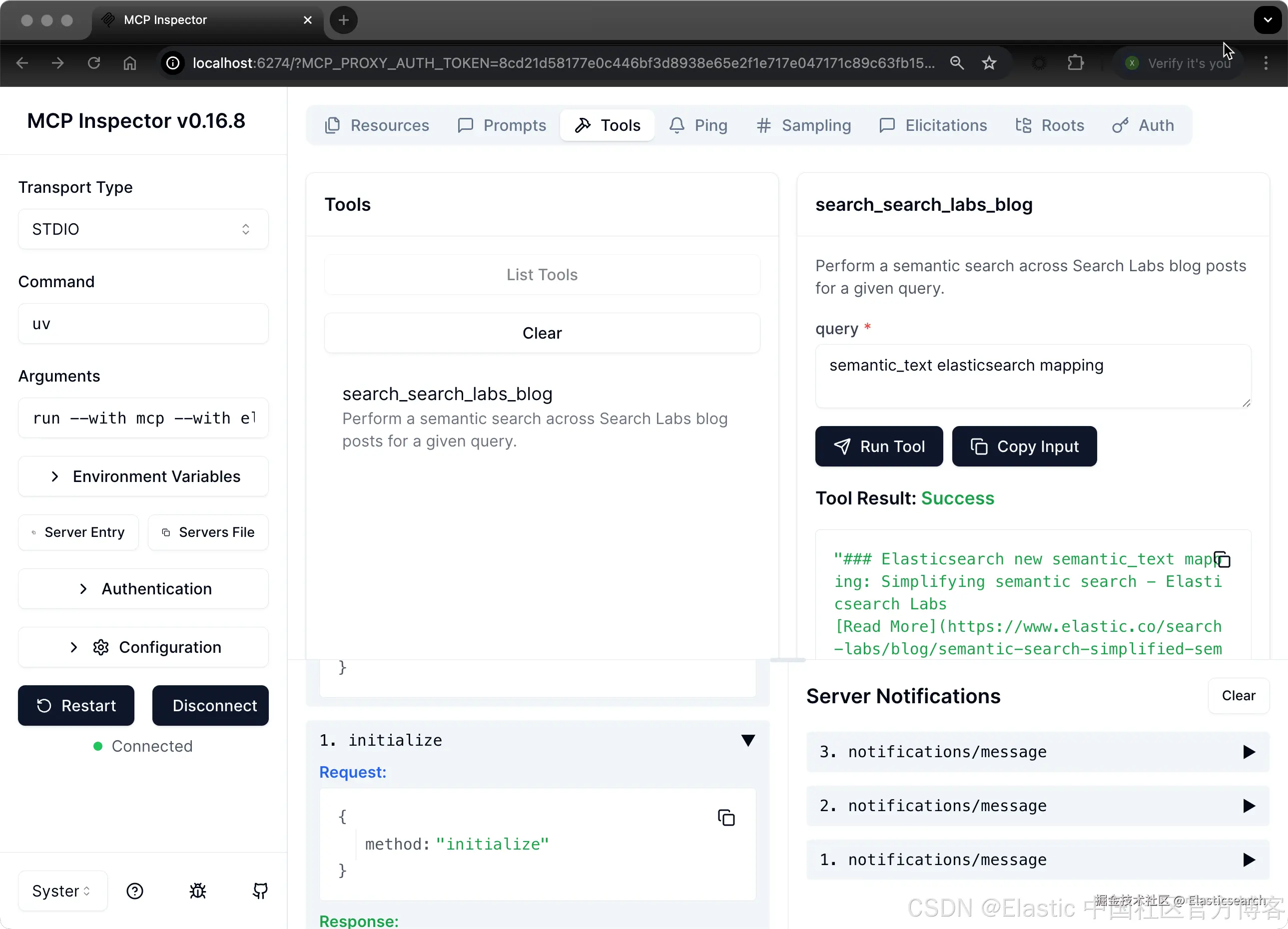 让我们构建一个 MCP Tool,使你能够在 Elastic Search Labs 的博客中进行语义搜索。助手将根据用户的意图使用此工具。