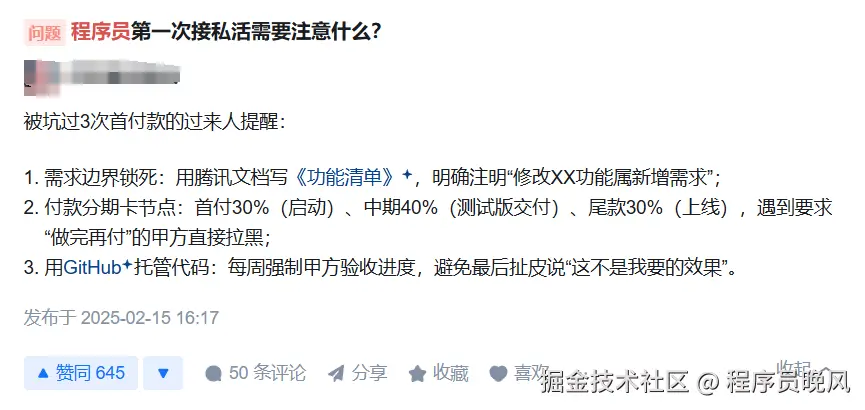除了这些平台型网站,一些技术社区也是不错的外包信息来源,比如 V2EX 的酷工作版块、掘金的招聘/合作标签,经常会有个人或中小团队发出紧急需求贴。