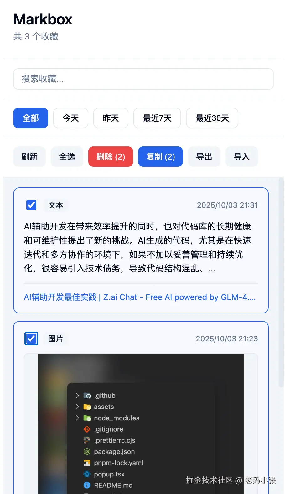 先直说结论:我做了一个浏览器侧边栏插件,叫 Markbox。用起来很简单——在网页上划一段文字,或右键一张图,存进侧边栏,随手整理、批量删、批量复制、导出/导入。看似不起眼,但它解决的不是“复制粘贴”技术问题,而是“信息流失与记忆碎片化”的深层问题。