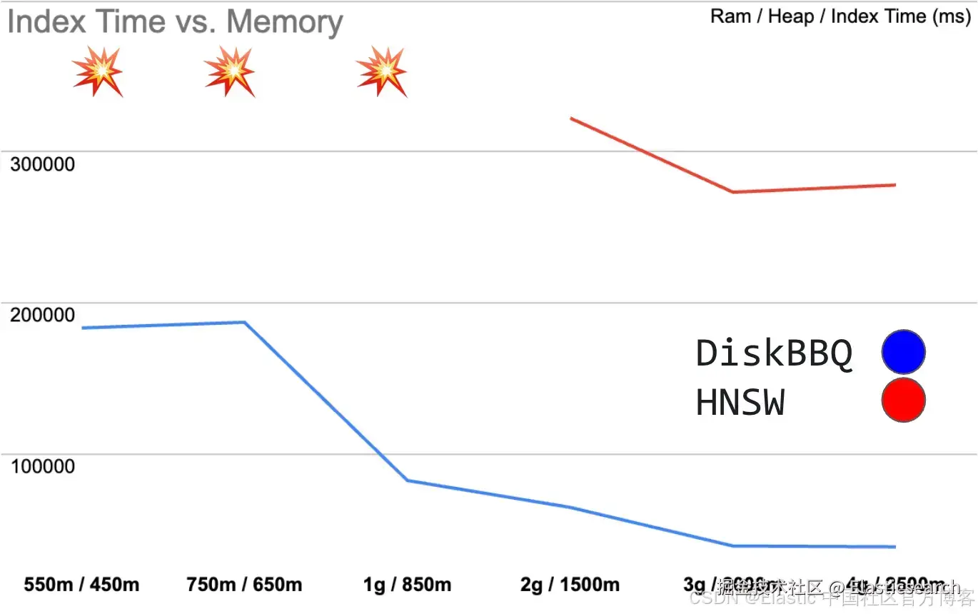 表 0. DiskBBQ 在超过 100 万向量下的对比。所有数据都能舒适地放入内存。DiskBBQ 在索引速度上能快上惊人的 10 倍,同时在 BBQ 量化向量上的查询速度几乎与 HNSW 一样快。