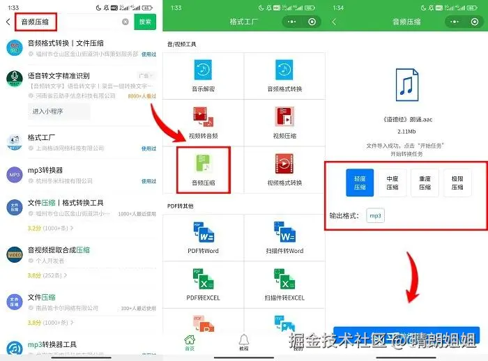 微信小程序也具有mp3在线压缩的功能,您只要在小程序的搜索框输入 “音频压缩”“mp3在线压缩” 等关键词,就可以找到一大堆符合条件的小程序。